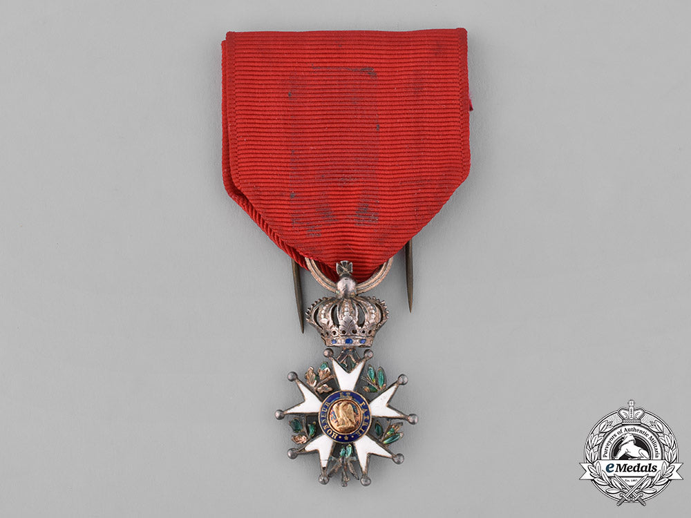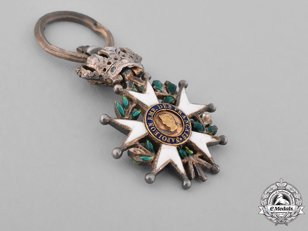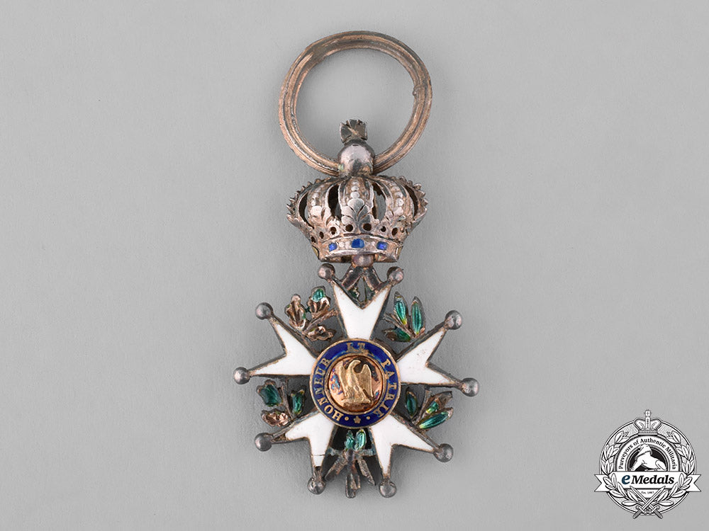 Ordre national de la Légion d'honneur. Instituted in 1802. First Empire, Type III (1806-1808), Reduced Size. In silver with red, white, blue and green enamels, Gold centrepieces, hallmarked with faces denoting French silver guarantee used between 1798-1808, measuring 20.3 mm (w) x 32 mm (h) inclusive of its crown and laterally-pierced ball suspension, chipping and crazing evident in the white enamels on the arms on both sides and in the blue enamelled jewels on the obverse of the crown, along with chipping in the green enamels on both sides of the wreath, original ribbon with dual prong pinback, good.