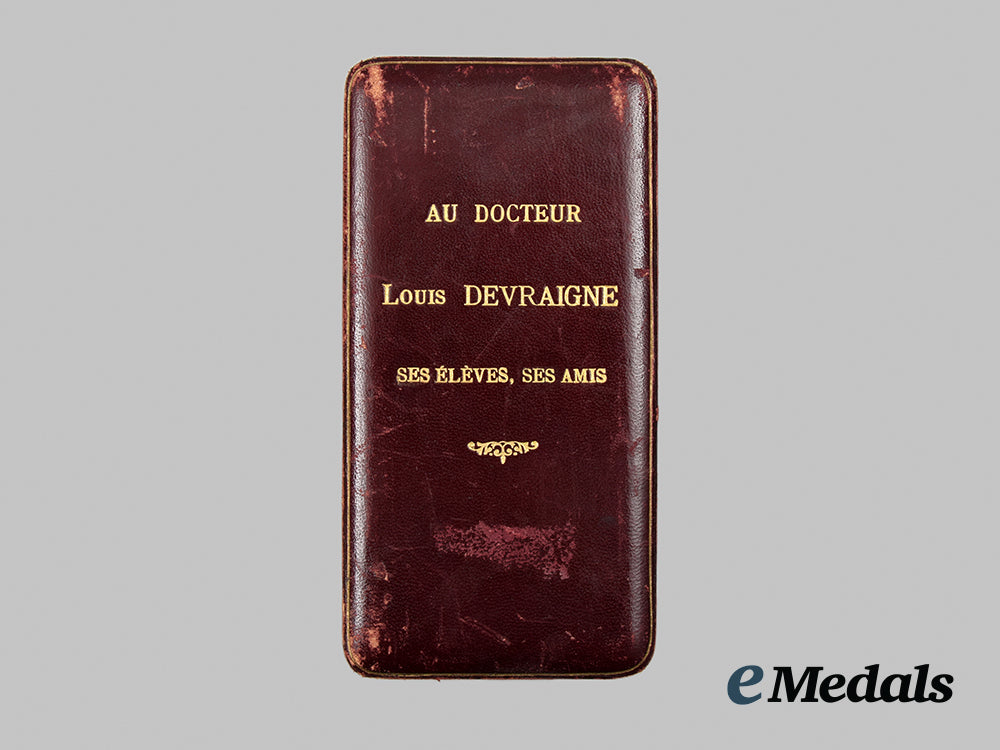 Footnote: The Legion of Honour was instituted in 1802 by Napoleon Bonaparte. It is the highest French order of merit and is awarded for eminent service to the nation, civilian or military, in five grades: Grand Cross, Grand Officer, Commander, Officer and Knight. This particular model was instituted 16 March 1852. This Legion of Honour was awarded to Louis Devraigne (1876-1846). He was a doctor in obstetrics and the head of the Maternity department at Lariboisiere Hospital and head of the clinic at the Faculty of Medicine of Paris.
