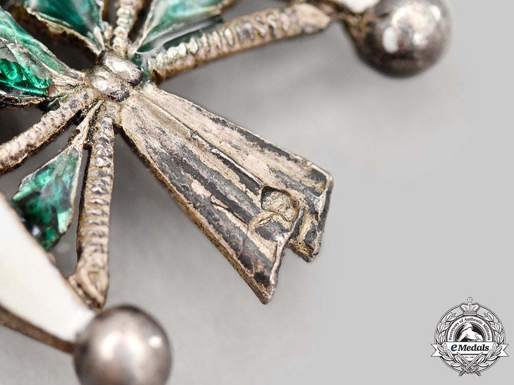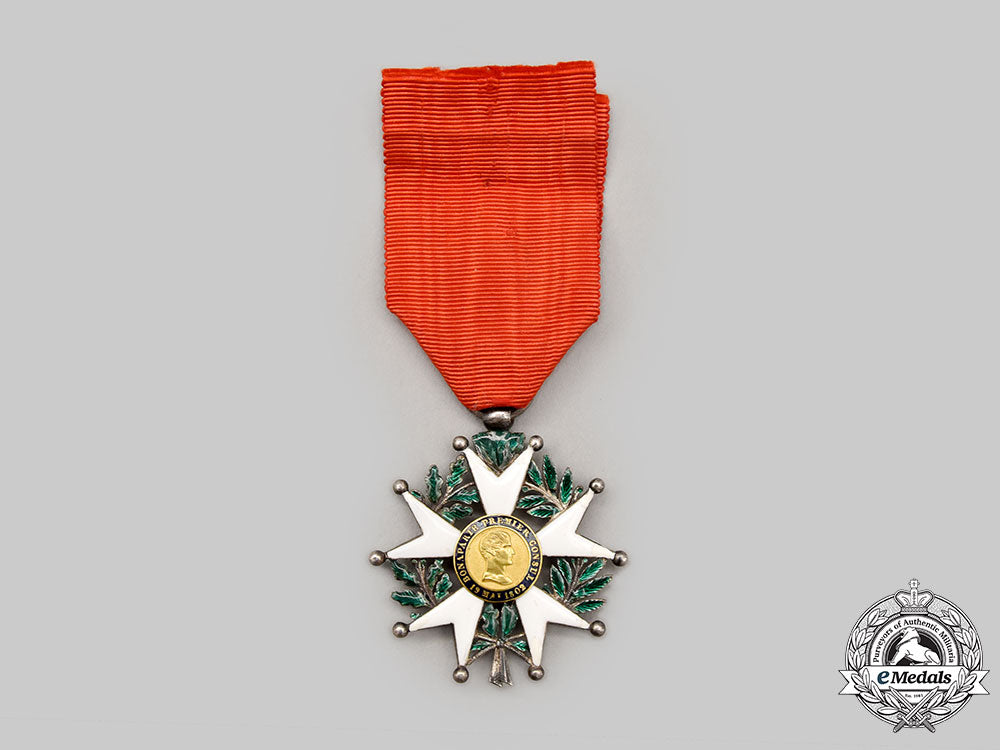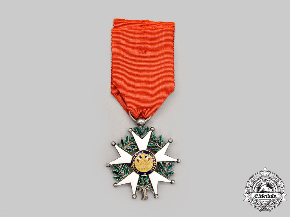 (Ordre de la Légion d'Honneur, Chevalier). Instituted in 1802. Type II (1848-1851) In silver with blue, white and green enamels, both centrepieces in Gold, hallmarked with a boar's head on the tip of the ribbon on the reverse, measuring 45.8 mm (w) x 50.5 mm (h) inclusive of its laterally-pierced ball suspension, repair evident in the white enamels on the arms on both sides, very fine.