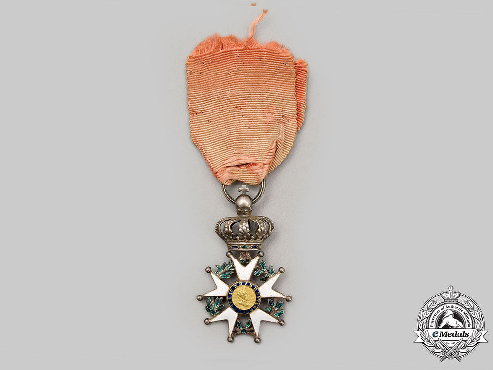 (Ordre de la Légion d'Honneur). Instituted in 1802. (1814-1830). In silver with blue, white and green enamels, both centrepieces in Gold, hallmarked with a fasces on the ring, measuring 26.7 mm (w) x 44.5 mm (h) inclusive of its crown and laterally-pierced ball suspension, chipping evident in the green enamels in the leafing on the reverse, original ribbon, better than fine.