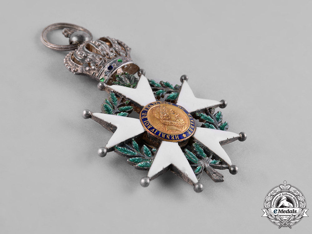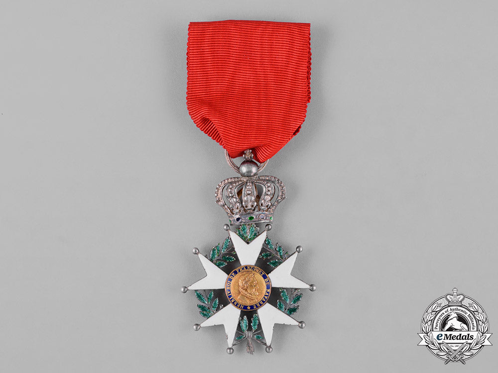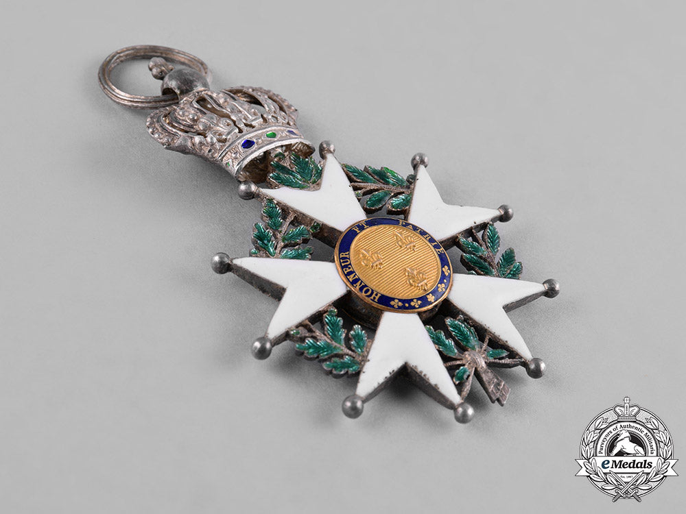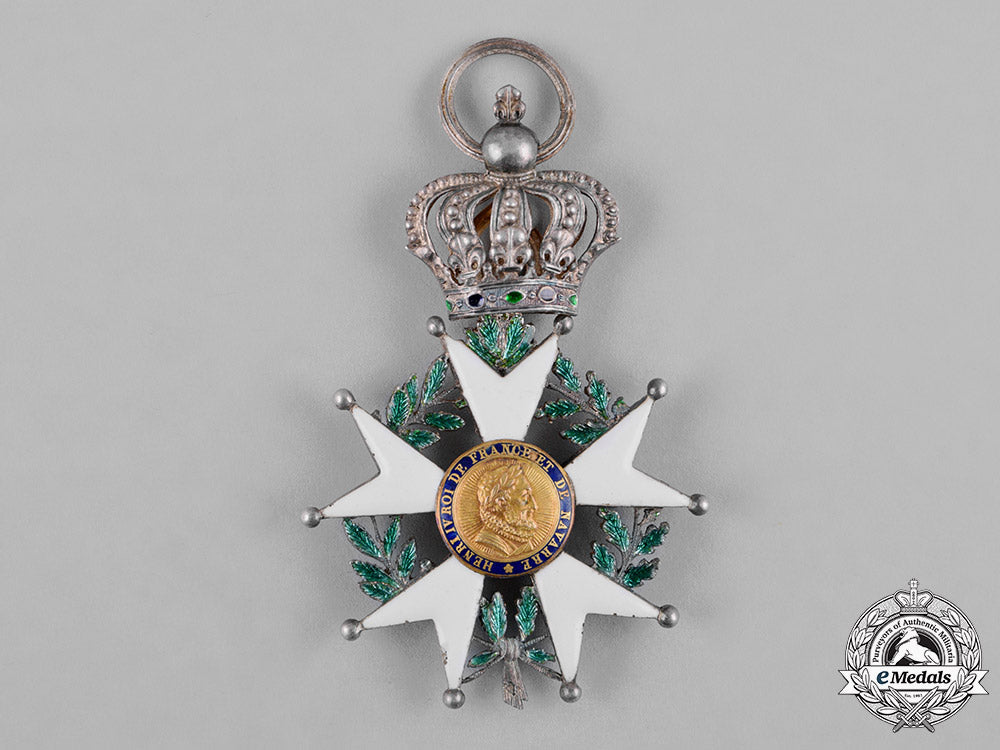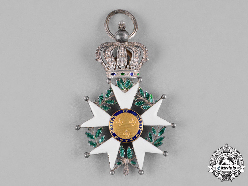 (Ordre national de la Légion d'honneur, Chevalier). Instituted in 1802. 1814-1830 Issue. In silver with blue, white and green enamels, 18K Gold centrepieces, measuring 44 mm (w) x 66.8 mm (h) inclusive of its crown suspension, hallmarked with a rabbit's head on the tip of the ribbon on the obverse, chipping evident in the white enamels on the arm at 7 o'clock on the obverse, fine chipping in the green enamels on both sides of the wreath, replacement ribbon, fine.