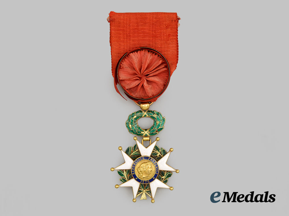 (Republique Francaise). Instituted in 1802. In 18 karat gold, with white, blue, and green enamels, five-pointed star surrounded by laurel wreath, each of the arms finished with two finials, obverse centre shows profile of Marianne facing right with inscription “République Francaise 1870”, reverse centrepiece shows flag of France surrounded by blue-enameled ring with the inscription “Honneur et Patrie”, inclusive of green-enameled laurel wreath 88.9 mm (h) x 38.8 mm (w), very fine condition.