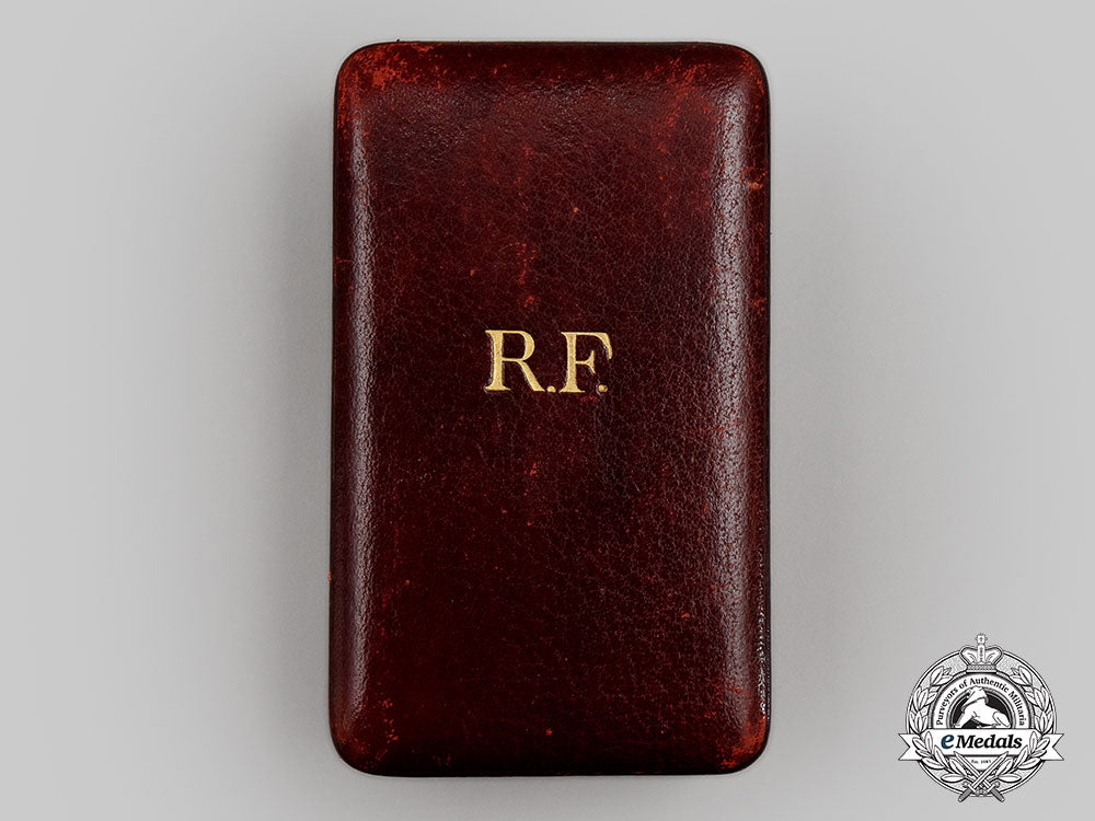 Contained in its case of issue, a dark red leatherette exterior marked R.F, the interior presents a silk lid marked Arthus Bertrand PARIS, with a partial dark blue recessed velvet medal bed with a section for the ribbon, measures 100mm (w) x 170mm (l) x 40mm (d), interior lid heavily ripped, light scuffing to exterior, in very fine condition.