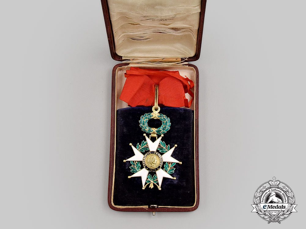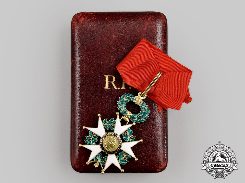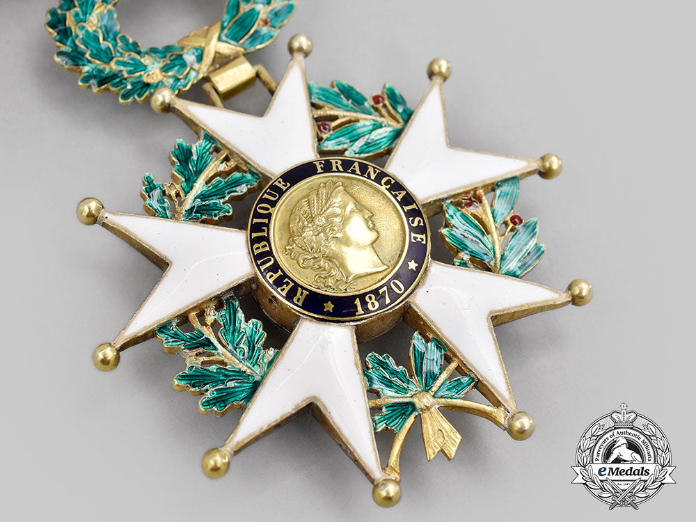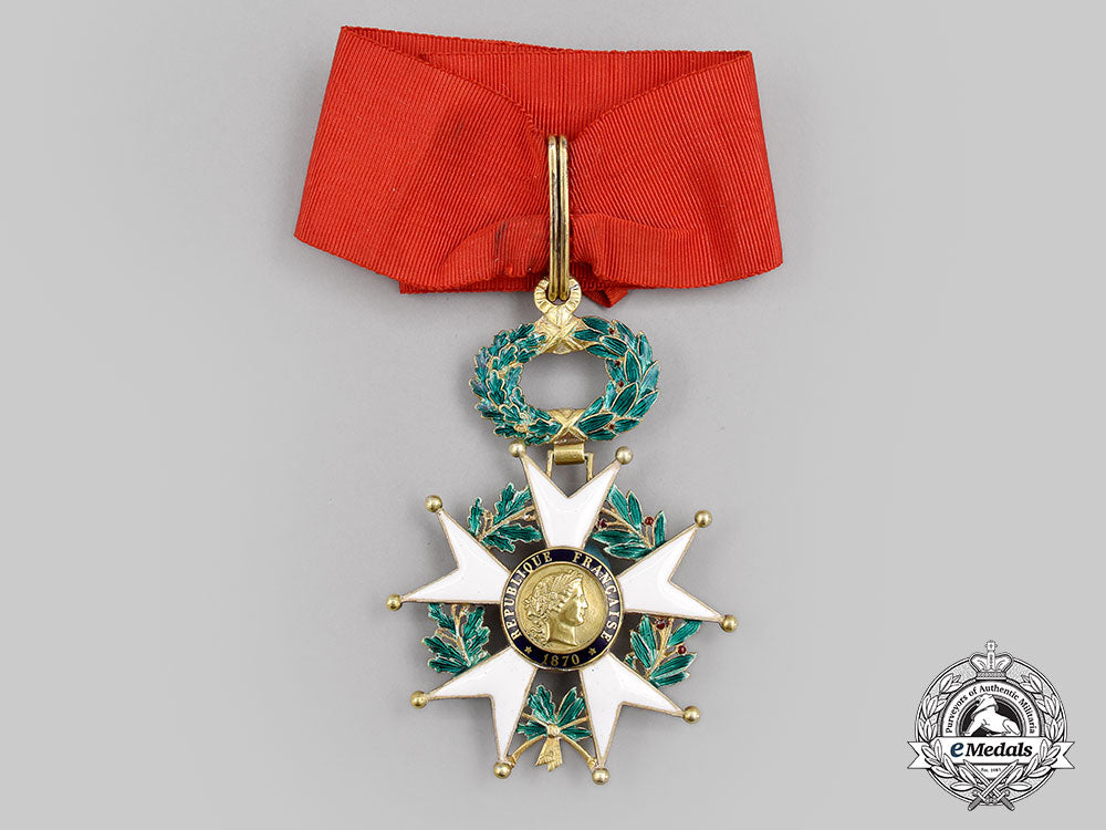 Instituted May 19, 1802. In silver gilt, a white enamelled Maltese cross with ball finials, with sections of a laurel and oak leaf wreath between the arms, the obverse medallion features a right facing portrait of Marianne, surrounded by the blue enamel ring inscribed REPUBLIQUE FRANCAISE 1870, the reverse HONNEUR ET PATRIE, the badge is surmounted by a large wreath, measures 63.45mm (w) x 92.05mm (h – inclusive of wreath suspension), weighs 28.8 grams including ribbon, worn on original red neck ribbon, silver hallmarked on wreath tassel at 6 o’clock, enamels intact, in extremely fine condition.