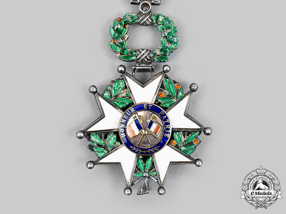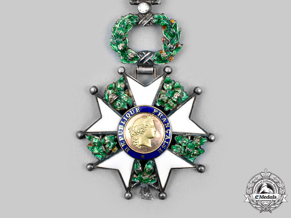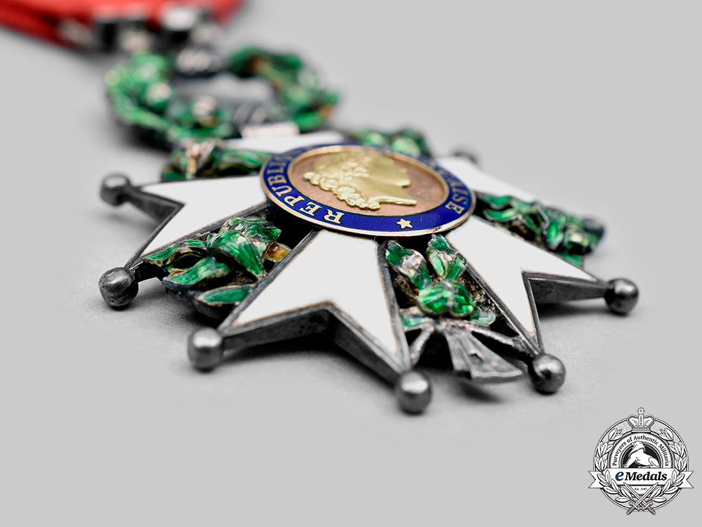 (Legion de’honneur). Instituted May 19, 1802. Type VIII, Third Republic. (Issue 1870-1951). In silver, a white Maltese cross with ball finials, sections of green enamelled oak leaf and laurel wreath clusters in each quadrant, the obverse presents a Gold centerpiece of right facing profile of Marianne, surrounded by a blue enamel ring inscribed REPUBLIQUE FRANCAISE, the reverse centerpiece presents two crossed French flags superimposed on a Gold field, surrounded by a blue enamel wreath inscribed HONNEUR ET PATRIE, suspended from a thick green enamelled oak and laurel wreath numbered 1676 on reverse integral loop, top connect to a central diamond, the suspension ring has four diamonds, presenting an overall V shape, measures 42.66mm (w) x 60.88mm (h – inclusive of integral diamond on wreath suspension), weighs 28.3 (including ribbon), marked on the silver bow at 6 o’clock and on the suspension ring with a boars head denoting French manufacturing and guarantee as of 1838, also maker marked on suspension ring denoting Arthus-Bertrand manufacture, worn on original ribbon, badge is convex in shape, causing wear to enamels in areas of high relief on obverse, dark patina on silver, in overall near extremely fine condition.