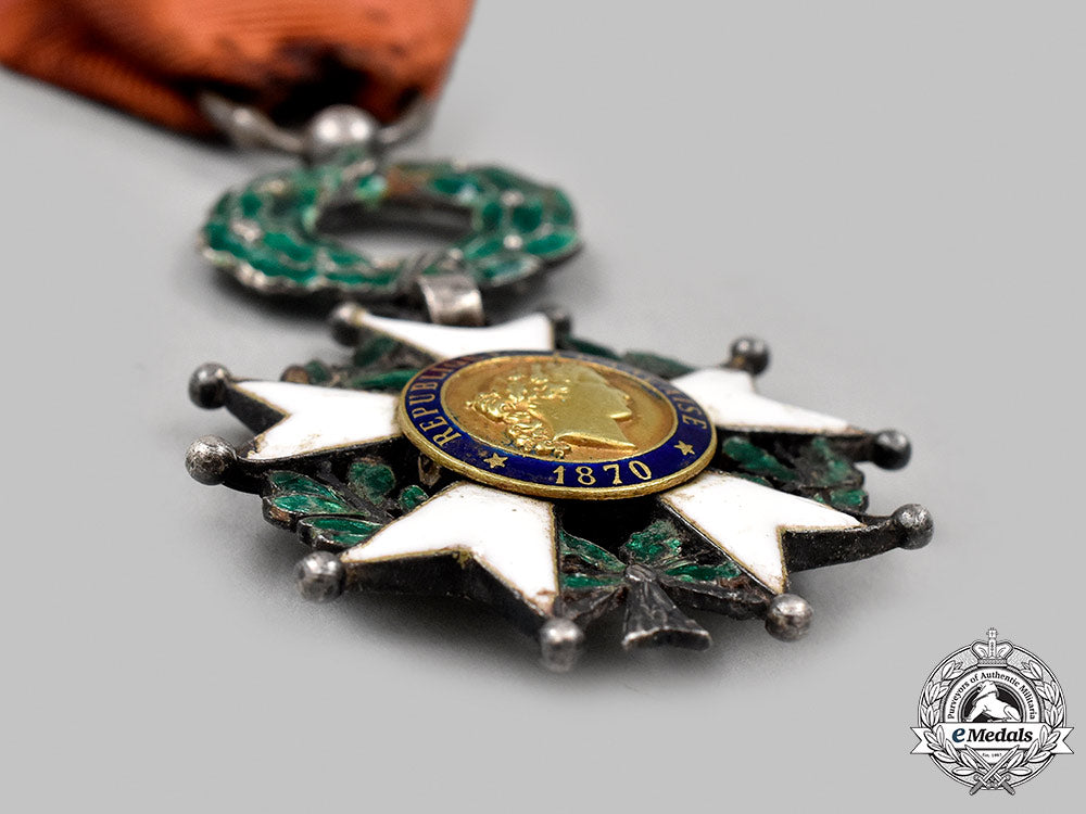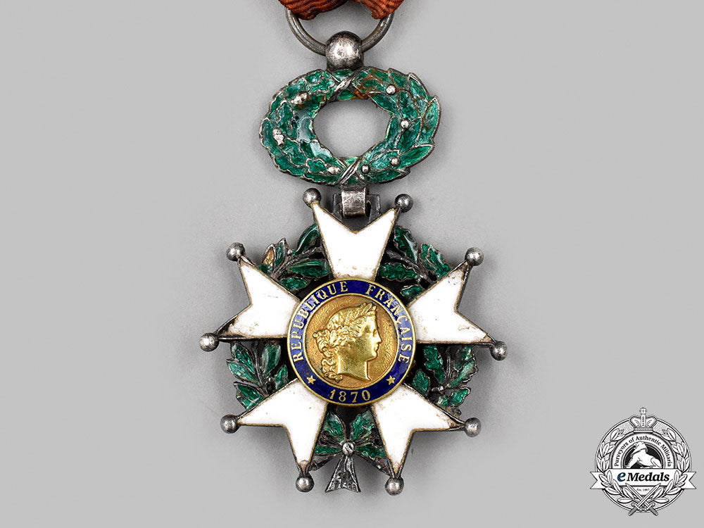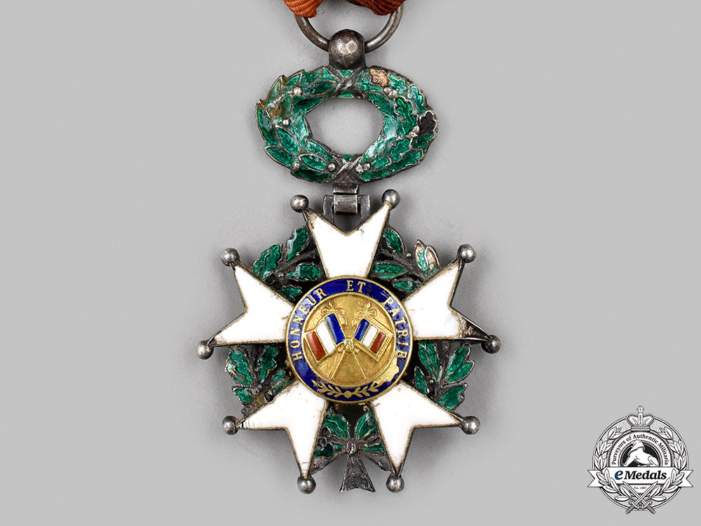 (Ordre de la Légion d'Honneur, Chevalier). Instituted in 1802. In silver with blue, white and green enamels, both centrepieces in Gold, hallmarked with an eagle's head on the tip of the ribbon on the obverse, measuring 39 mm (w) x 59.2 mm (h) inclusive of its wreath and laterally-pierced ball suspension, chipping and loss evident on both sides in the white enamels on the arms, in the blue enamels on the reverse centrepiece ring and in the green enamels of the wreath and the badge, soiled original ribbon, fair.