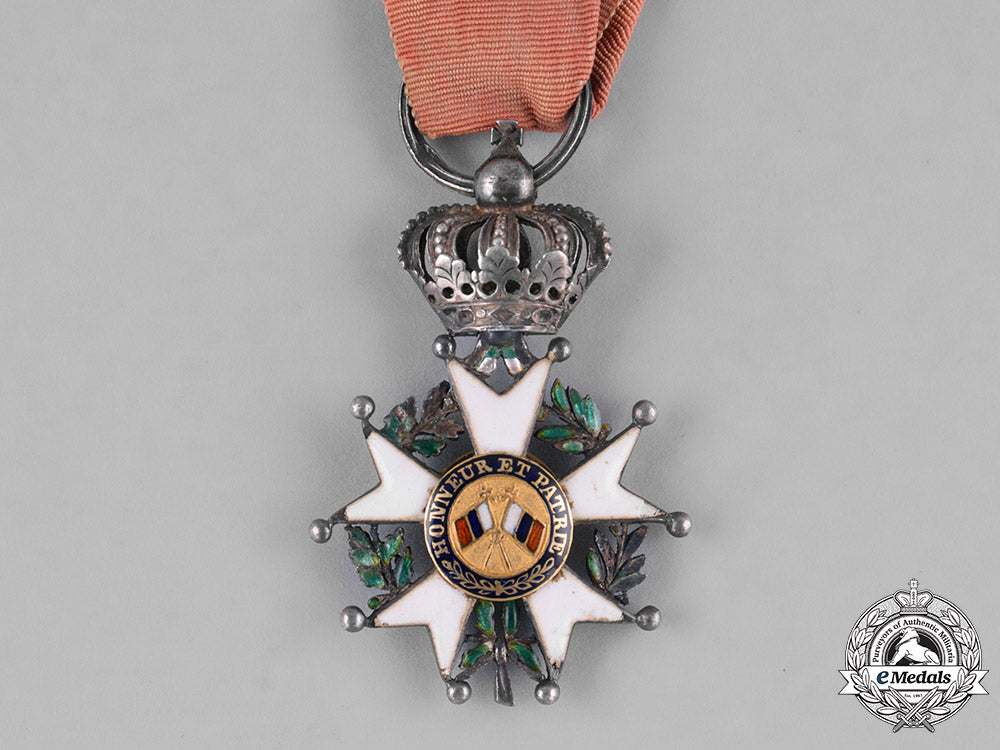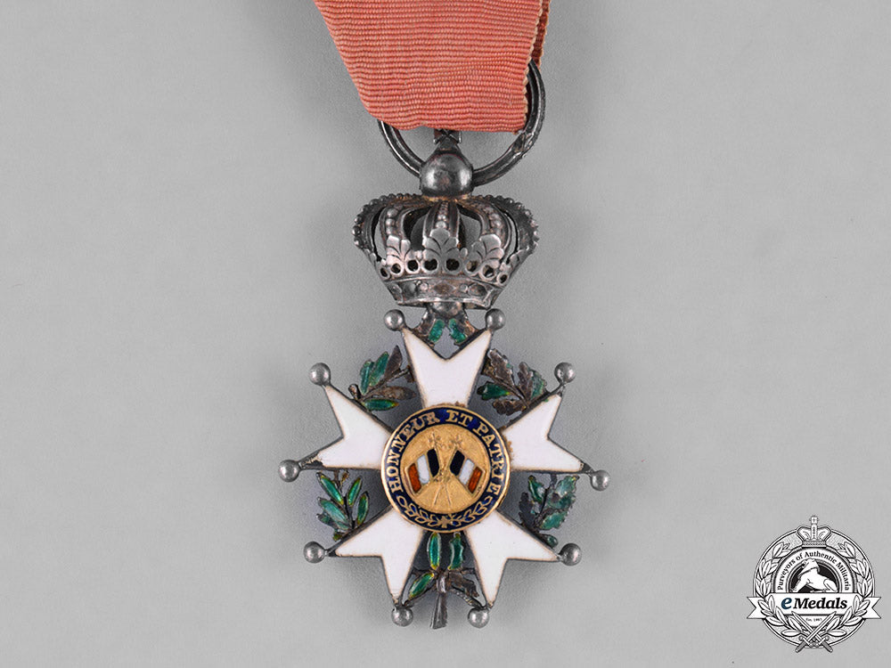 Ordre national de la Légion d'honneur, Chevalier. Instituted in 1802. July Monarchy (1830-1848), ALTERED VERSION. In silver with red, white, blue and green enamels, Gold centrepieces, both centrepieces exhibiting the crossed flags version traditionally used on the reverse, one of the centrepieces with the colours of the flags in the wrong order (white, blue, red), both centrepieces likely having been replaced from the original award, hallmarked on the ring, measuring 29.5 mm (w) x 45.3 mm (h) inclusive of its crown and laterally-pierced ball suspension, chipping and crazing evident in the white enamels on the arms and in the green enamels on the wreath on both sides, original ribbon, fair.