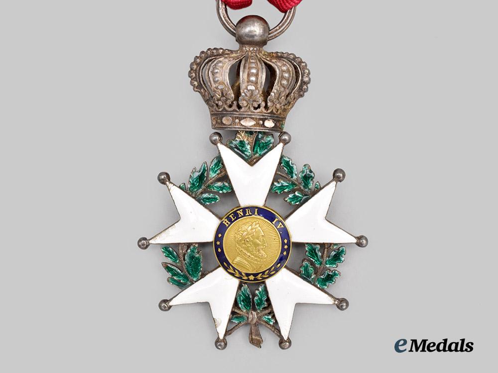 (Ordre de la Légion d'Honneur). Instituted in 1802. In silver with blue, white and green enamels, centre pieces in Gold with red, white and blue enamels bearing the right facing bust of Henri IV on the obverse, and two crossed flags on the reverse, encircled by a green enamelled laurel and oak leaf wreath, unmarked, measuring 44.65 mm (w) x 64.77 mm (h- inclusive of its crown suspension), weighs 21.3 grams, accompanied by a replacement red ribbon, notable chips to the white enamel arms on the obverse and the reverse, and chips to the blue enamel ring on the reverse, in near very fine condition.