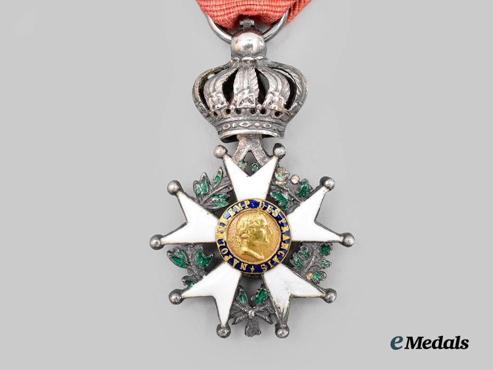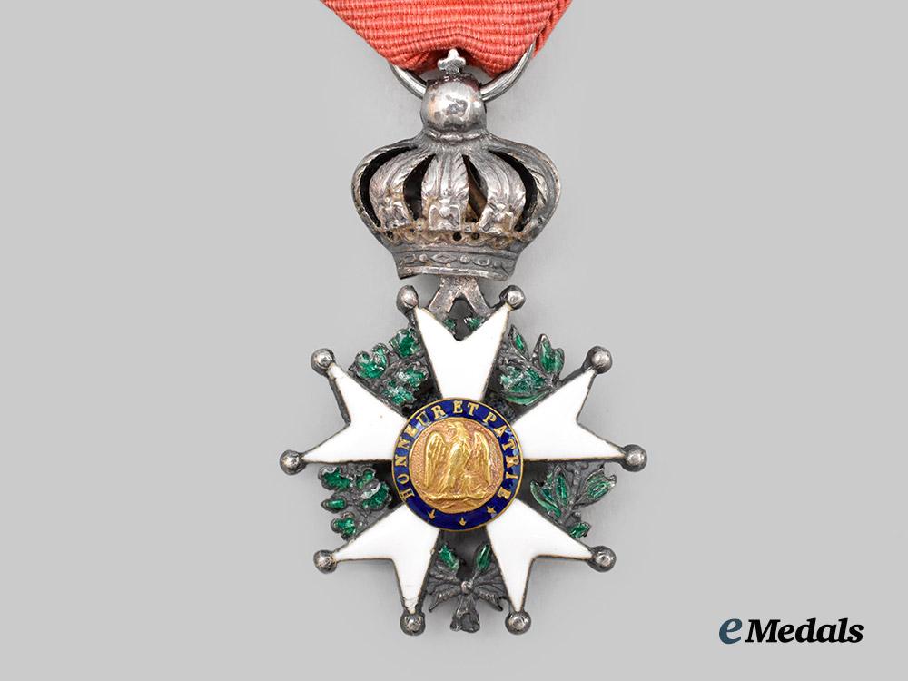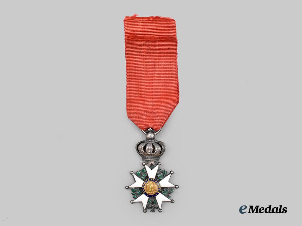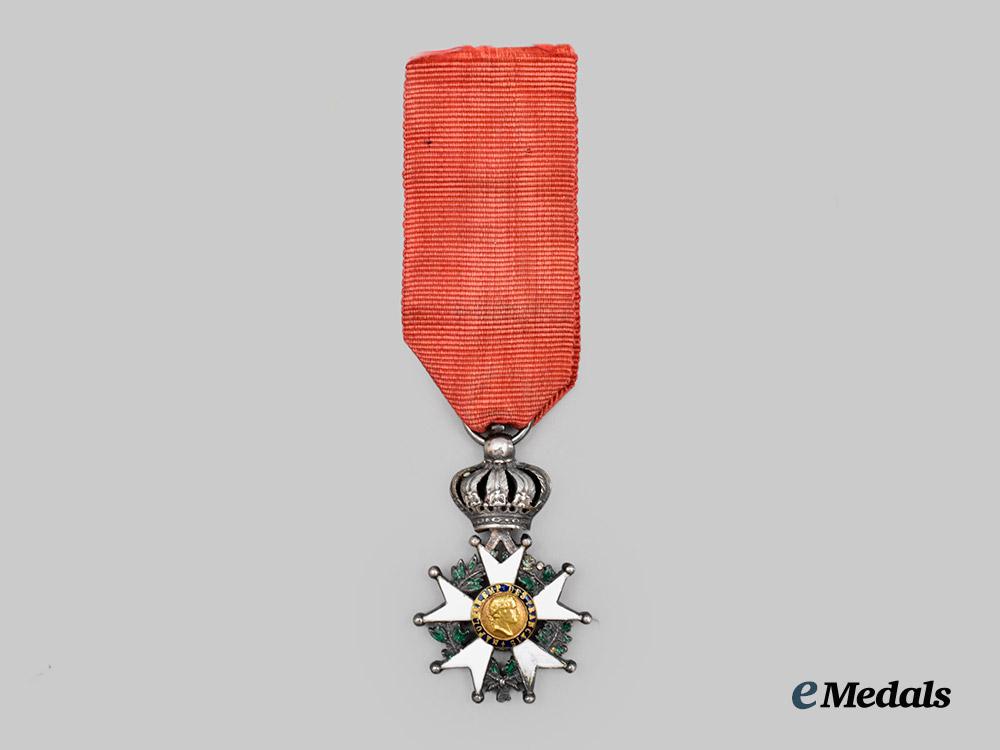 (Legionne d’Honneur). Instituted May 19 1802. Type VII. Second Empire. (1852-1870). A beautiful decoration, in silver, a white enamelled Maltese Cross with ball finials, green enamelled laurel and oak leaves in each quadrant, the obverse medallion in Gold presenting the right facing portrait of Luis Napoleon surrounded by the inscription NAPOLEON EMP. DES FRANCAIS in a blue enamel ring, the reverse medallion featuring an eagle with spread wings, surrounded by a blue enamelled ring inscribed HONNEUR ET PATRIE, the decoration is surmounted by a silver crown with eight half arches bearing eagle features, marked at 6 o’clock with a boars head denoting 1838-1962 French manufacture and 800 silver fineness, 23.3 mm (w) x 36.5mm (h - inclusive of cross adorned integral ball), weighs 5.77 grams, worn on red ribbon, enamel flacks to white arms most notably on the obverse 4 o’clock arm, the center medallion slightly loose, dark patina, a scarce decoration in very fine condition.