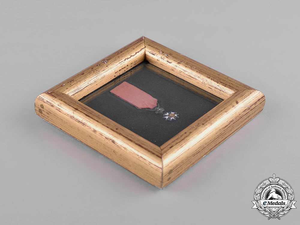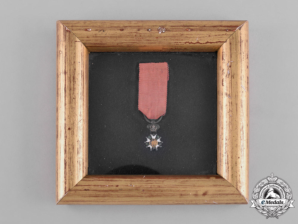Ordre national de la Légion d'honneur, Officier. Instituted in 1802. 1815 - 1830 Issue. In silver with white and green enamels, Gold centrepiece on the obverse, the reverse centrepiece undetermined, measuring 9 mm (w) x 15.5 mm (h) inclusive of its laterally-pierced ball suspension, chipping and crazing evident in the white enamels on four of the five arms and in the blue enamels on the centrepiece ring on the obverse, original ribbon, under glass in a 92 mm (w) x 92 mm (h) wooden frame with a hook on the reverse for wall hanging, fine.