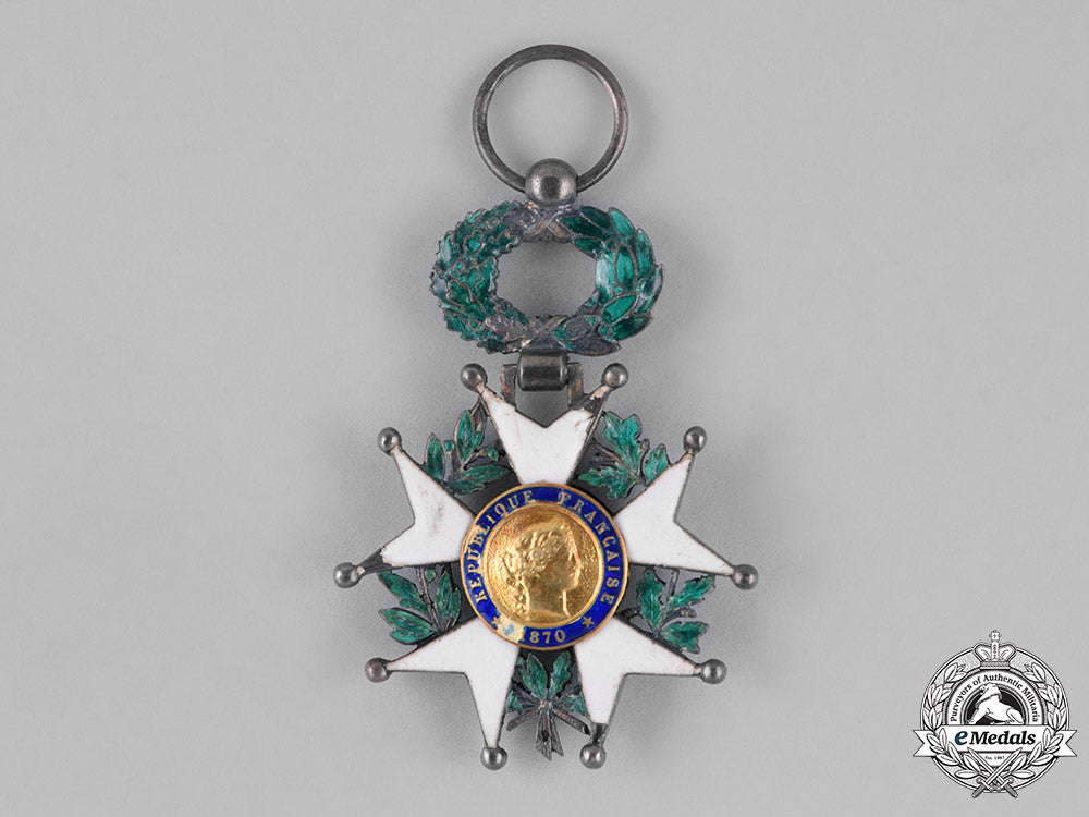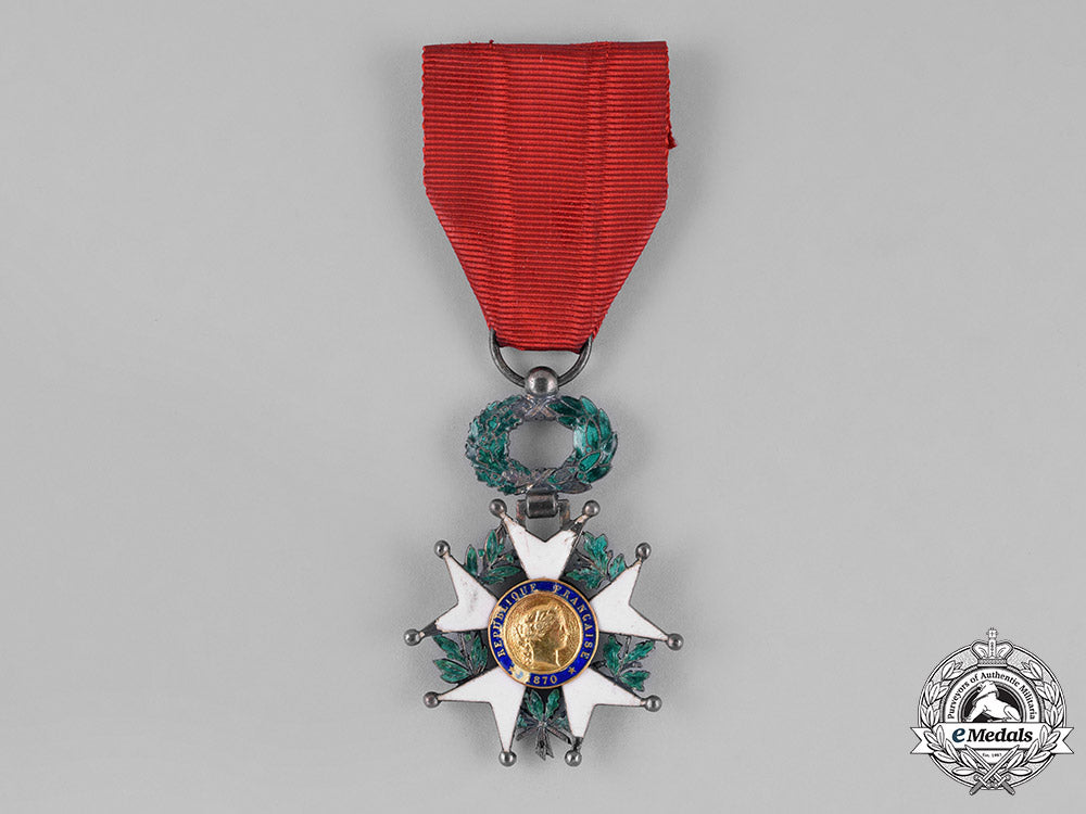 Ordre National de la Légion d'honneur. Instituted in 1802. 1870-1951 Issue. In silver with red, white, blue and green enamels, Gold centrepieces, laterally-pierced ball suspension, hallmarked with a boar's head on the tip of the ribbon on the obverse, measuring 41.8 mm (w) x 61.3 mm (h) inclusive of its crown suspension, chipping evident in multiple locations in the white enamelled arms on both sides, in the blue enamels on both centrepiece rings and in the green enamels on the wreath, replacement ribbon, fair