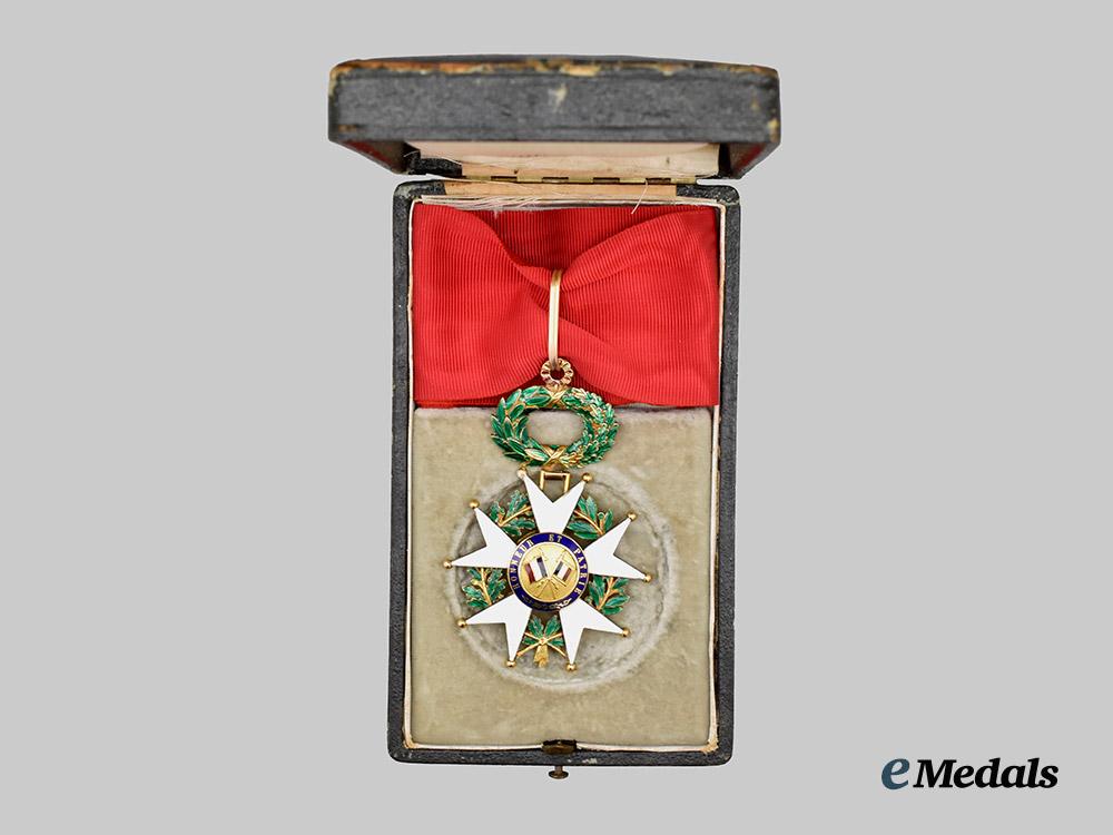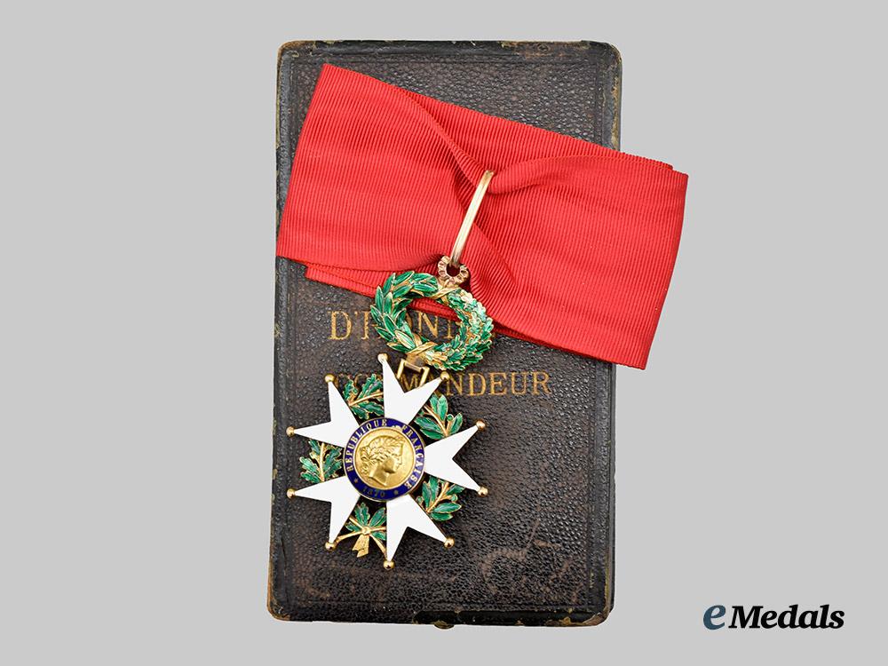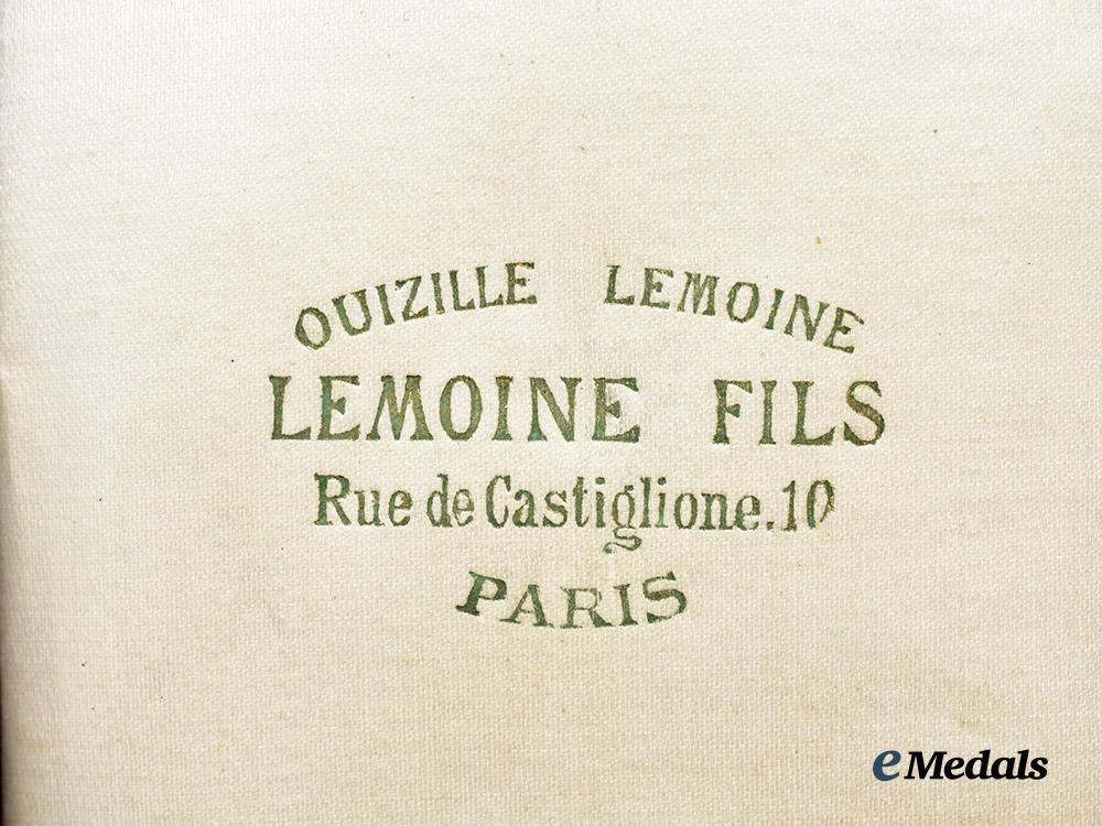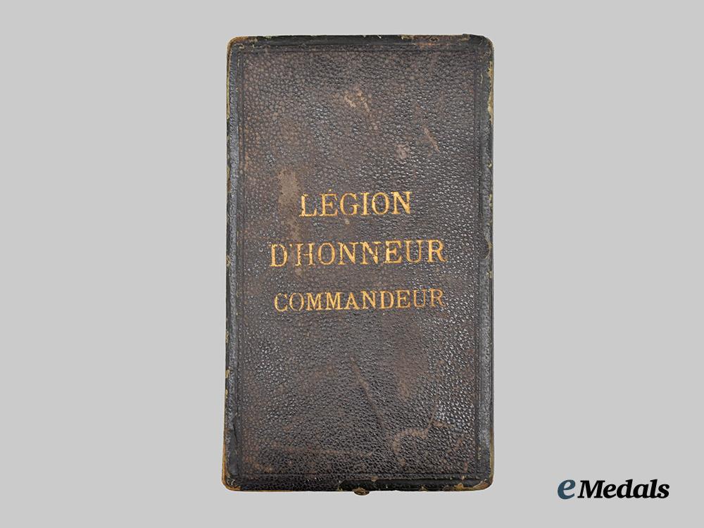 Accompanied by its original case of issue, a black leatherette case marked LEGION D’HONNEUR COMMANDEUR on the lid, interior in silk marked LEMOINE FILS denoting manufacturer, with velvet recessed medalbed and section for ribbon, measures 95mm (w) x 160 mm (h) x 30 mm (d), wear to exterior, clasp functional, in better than fine condition.