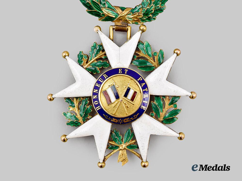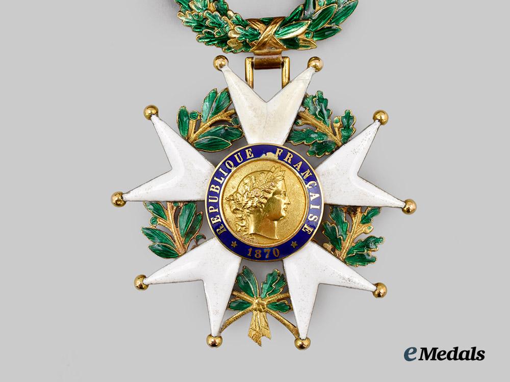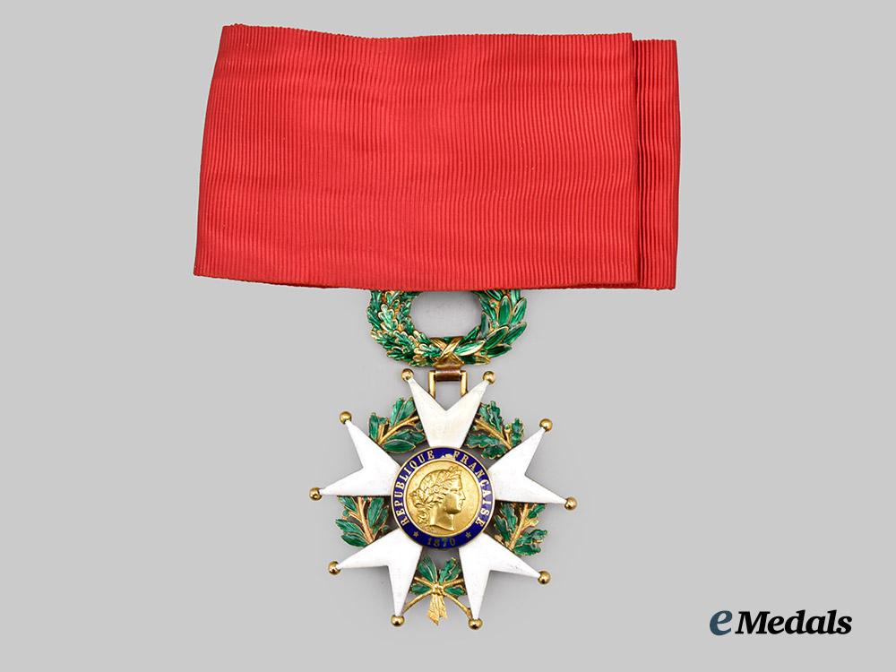 (Honneur et Patrie). Instituted in 1802. In 18 karat gold with white, blue, and green enamels, five-pointed star in white enamel surrounded by green-enamelled laurel wreath, each of the arms finished with two finials, the obverse central medallion in Gold features a rightward facing effigy of Marianne surrounded in a blue enamel ring inscribed REPUBLIQUE FRANCAISE 1870, the reverse central medallion in Gold presents crossed flags surrounded in a blue enamel ring inscribed HONNEUR ET PATRIE, the badge is suspended from a green enamelled wreath, measures 56.8 mm (w) x 85.2 mm (h), marked with an eagle head denoting gold manufacture between 1870-1919, weighs 39.5 grams, accompanied by a modern red neck ribbon, enamel cracks and chips throughout arms, in obverse blue enamel inscription ring, and on surmounting wreath, remains in very fine condition.