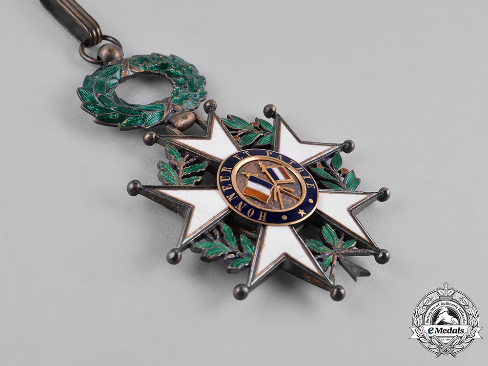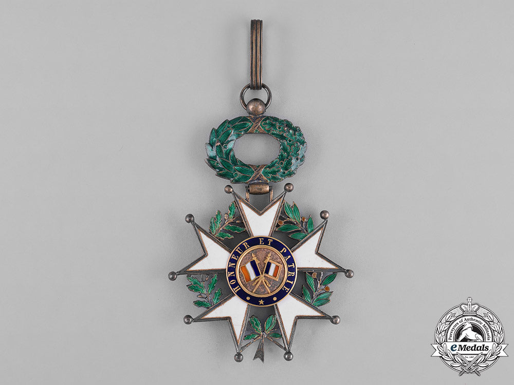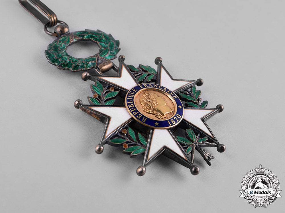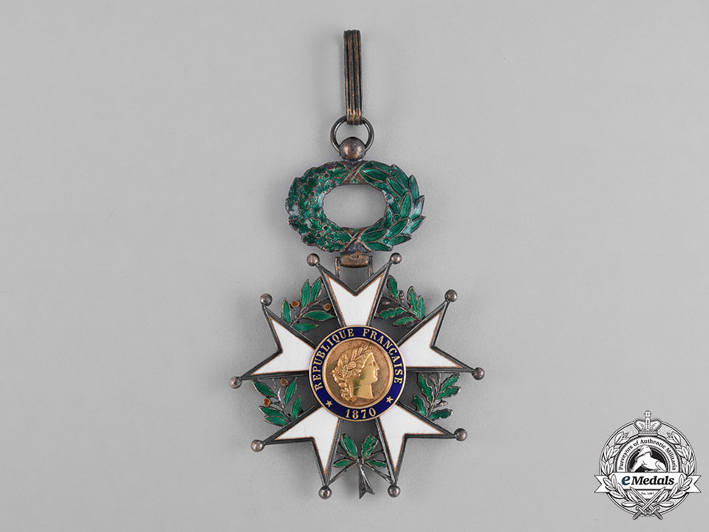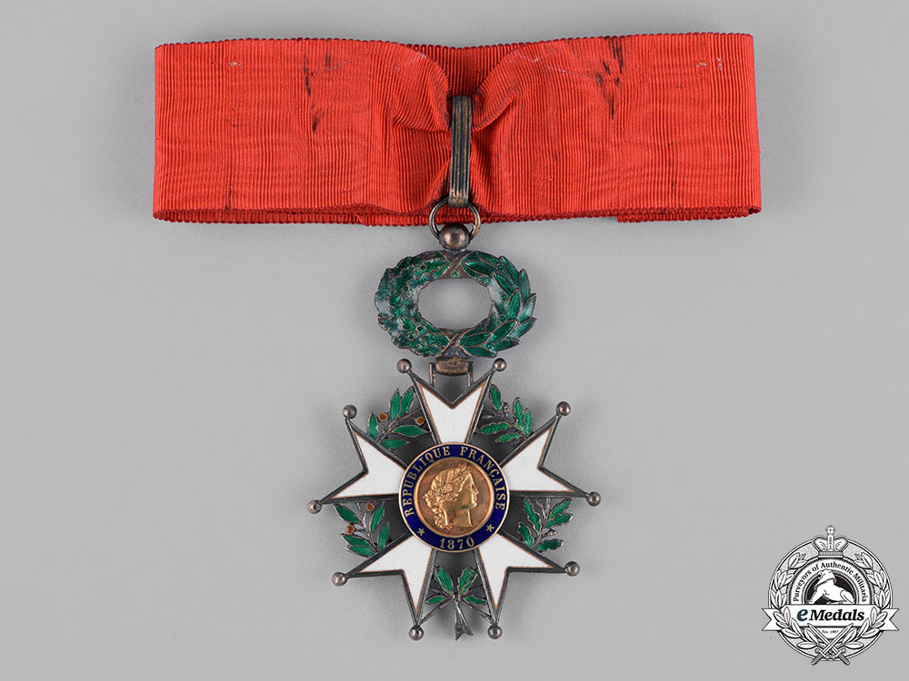 (Ordre national de la Légion d'honneur). Instituted 1802 by Napoleon Bonaparte. (1870-1951 Issue). A five-point silver maltese cross with white enamel arms with ball finials, green and red enamel laurels in each quadrant, suspended by green enameled wreath, obverse centerpiece in Gold, surrounded by blue enameled ring inscribed REPUBLIQUE FRANCAISE 1870, reverse centerpiece presents crossed flags in Gold with red, white and blue enamels, surrounded by a blue enameled ring inscribed HONNEUR ET PATRIE (Honour and Fatherland), assay mark of a boar’s head on tip of the ribbon on reverse denoting .800 fineness and Paris manufacture post 1838, measuring 62 mm (w) x 89 mm (h - inclusive of wreath suspension and horizontally pierced ball), with light contact to white enamel arms, ball finial at 10 o’clock bent upwards, on original commander’s ribbon, extremely fine condition.