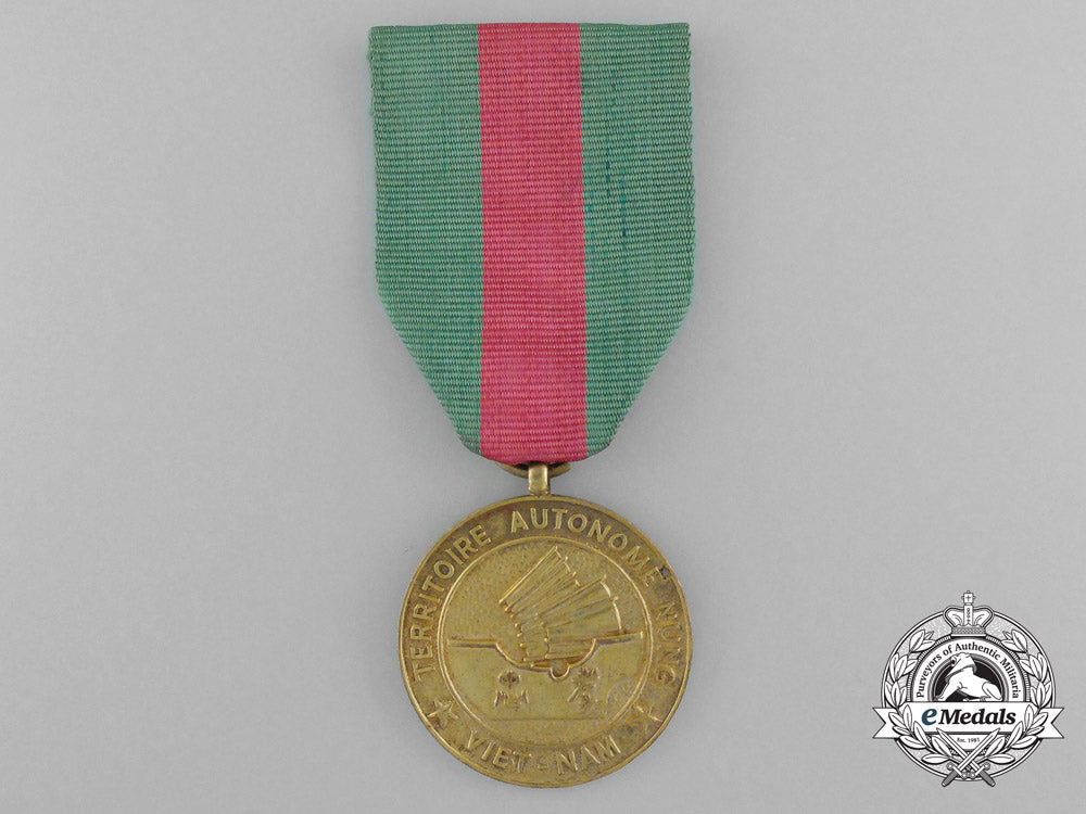 Footnote: French Colonial forces awarded this decoration in two classes (Officer and Knight) for meritorious service, to military and civilian personnel of the Nung (Montagnard) tribe. A rosette on the ribbon drape distinguishes the first or Officer class, but none are known to exist.