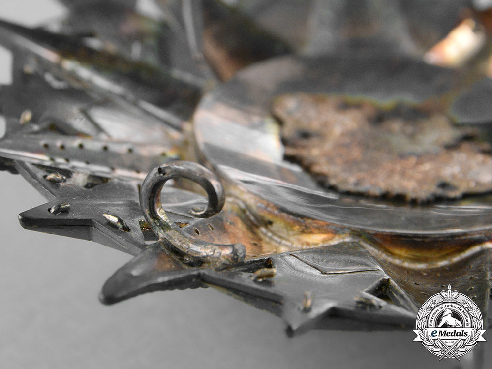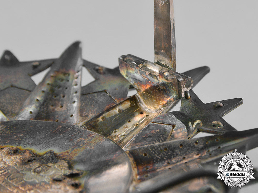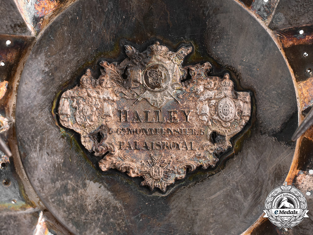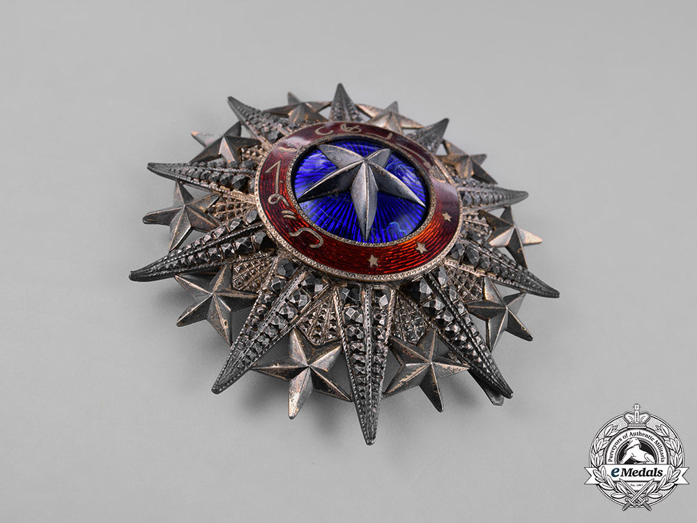 (Arabic: Order of the Light). Instituted 1887 by Mahmed ben Mohammed Sultan of Tadjourah. A finely made star consisting of ten pointed star, each arm having been hand filed, with clusters of three rays as well as a star in each quadrant, obverse centre presenting a large silver star on blue enameled background, with red enamel surround containing gilt Arabic characters, reverse with ornate makers cartouche of Halley, Paris, also with markers mark on pin, hallmarked on pin and catch with boars head denoting French small silver guarantee post 1838, dual stays, measuring 83 mm (w) x 89 mm (h), with enamel loss, toned silver, very fine.