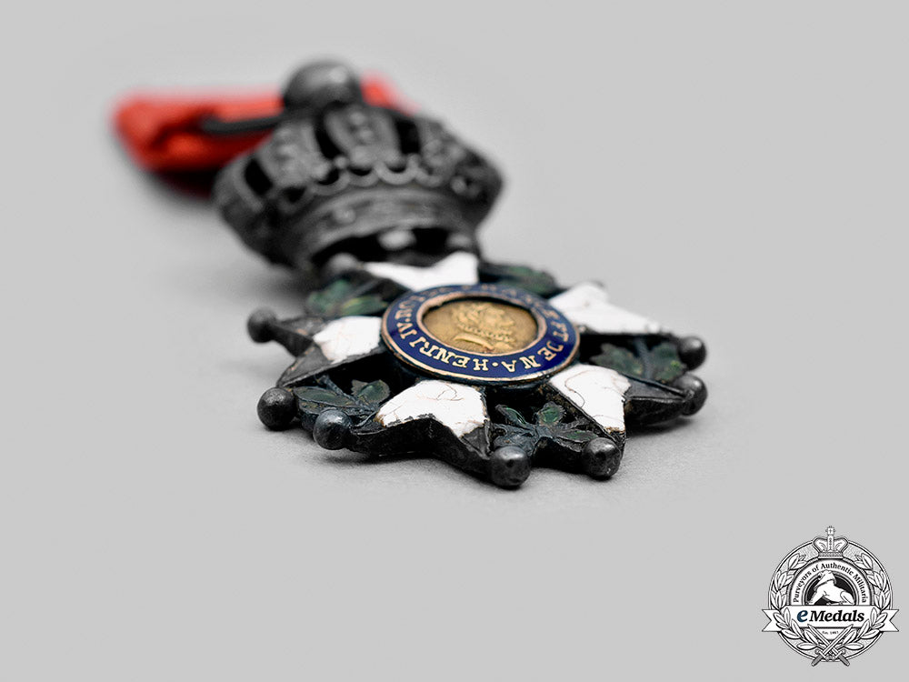 (Ordre National de la Légion d'honneur). Second Restoration. 1814-1830 Issue. In silver, a white five armed enamelled Maltese cross with ball finials and green enamelled laurel wreath in each quadrant, the central medallion in Gold presents a right facing portrait of King Henri IV, surrounded by a blue enamelled ring inscribed HENRI IV.ROI DE FRANCE ET DE NA, the reverse medallion features three Fleur-de-lis, surrounded by a blue enamel ring inscribed HONNEUR ET PATRIE, surmounted by a silver crown with eight arches and horizontally pierced ball, worn on a striated ring with unidentified mark, measures 25.7mm (w) x 45.6mm (h), weighs 8.3 grams, immense loss of enamel to white arms and green leaves, missing ball finial on 3 o’clock arm, cross missing from the ball suspension, very dark patina, wear associated with time, in fine condition.