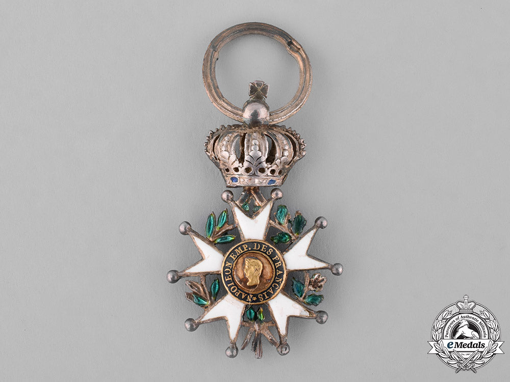 Ordre national de la Légion d'honneur. Instituted in 1802. First Empire, Type III (1806-1808), Reduced Size. In silver with red, white, blue and green enamels, Gold centrepieces, hallmarked with faces denoting French silver guarantee used between 1798-1808, measuring 20.3 mm (w) x 32 mm (h) inclusive of its crown and laterally-pierced ball suspension, chipping and crazing evident in the white enamels on the arms on both sides and in the blue enamelled jewels on the obverse of the crown, along with chipping in the green enamels on both sides of the wreath, original ribbon with dual prong pinback, good.