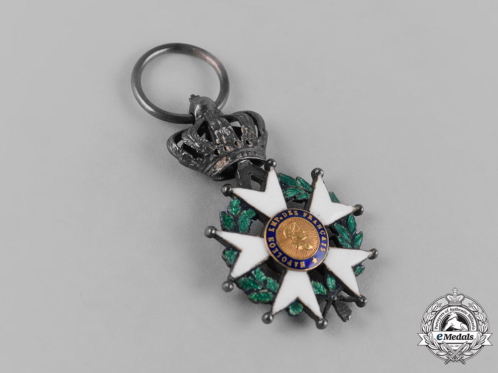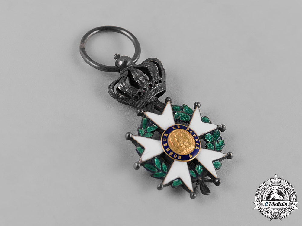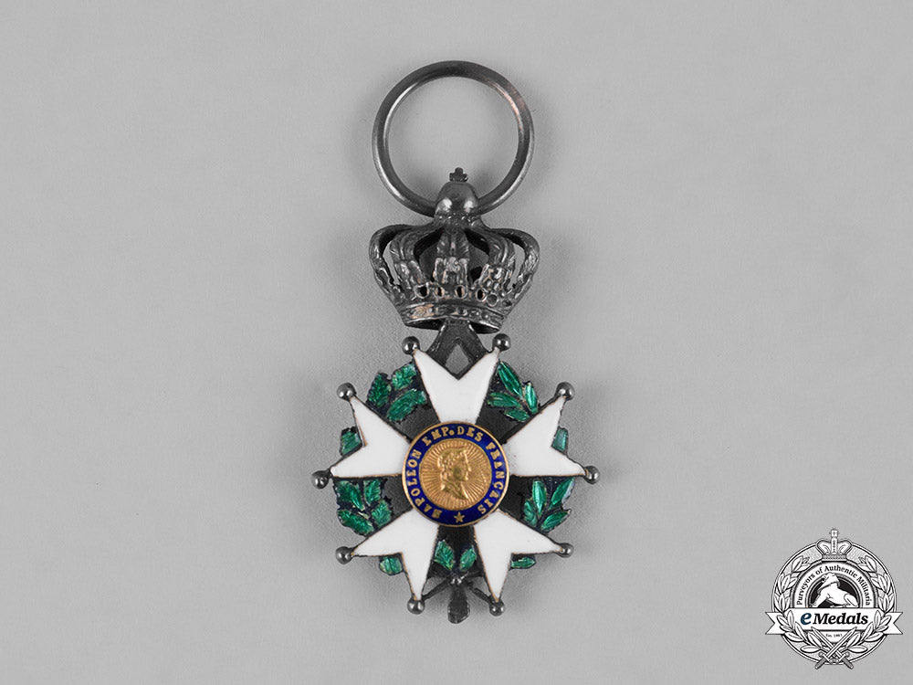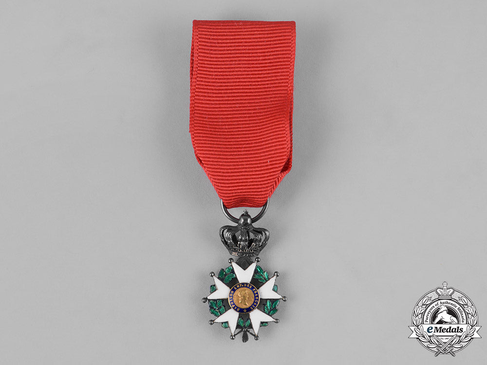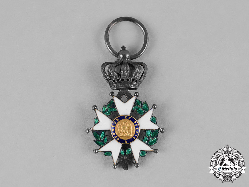 (Ordre national de la Légion d'honneur). Instituted 1802 by Napoleon Bonaparte. Type VII (1852-1870 Issue). Of high quality manufacture, an enameled white ball-tipped five-armed cross in silver, with enameled green laurel and oak wreath in each quadrant, surmounted by a typical of period Imperial crown in silver, with obverse center featuring a superimposed Napoleon’s portrait in Gold, surrounded by an elegant enameled blue ring inscribed REPUBLIQUE FRANCAISE 1870, the reverse featuring an engraved Napoleonic eagle in Gold, surrounded by an enameled blue border inscribed HONNEUR ET PATRIE (Honour and Fatherland), with French hallmark of a boar’s head denoting .800 silver fineness and Paris manufacture post 1838, measuring 19.86 mm (w) x 31.39 mm (h - inclusive the crown suspension), with toned silver and light contact, on original breast ribbon, fine condition.