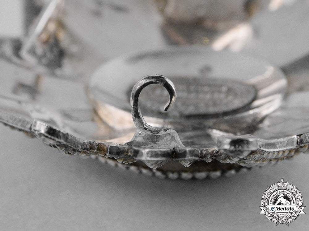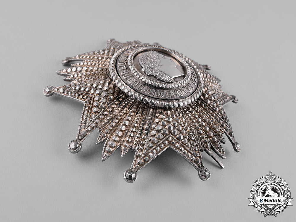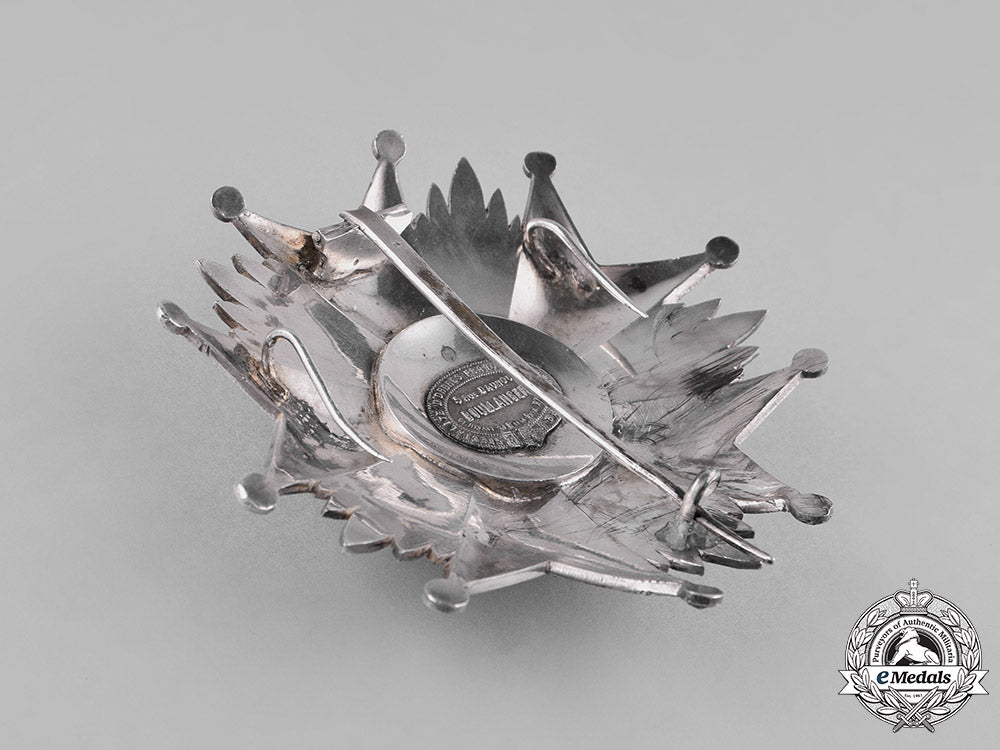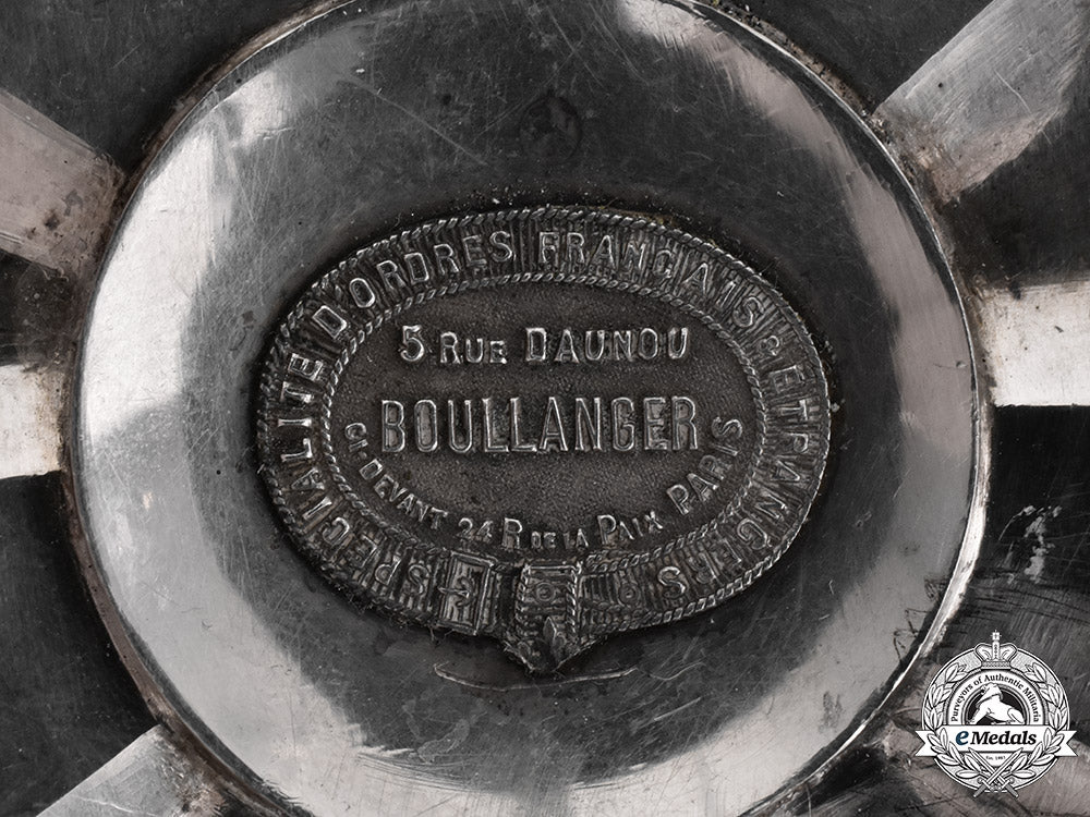 (Ordre national de la Légion d'honneur, Grand croix). Instituted in 1802. In silver, each of the five arms and ball finials are faceted, with five faceted rays between each of the arms, maker marked "BOULLANGER" on the reverse cartouche and hallmarked with a boar's head denoting French manufacture of 900 silver, post 1838 on the pin, measuring 90 mm (w) x 84 mm (h), vertical pinback flanked by dual stays, catch has been repaired, light contact, near extremely fine.