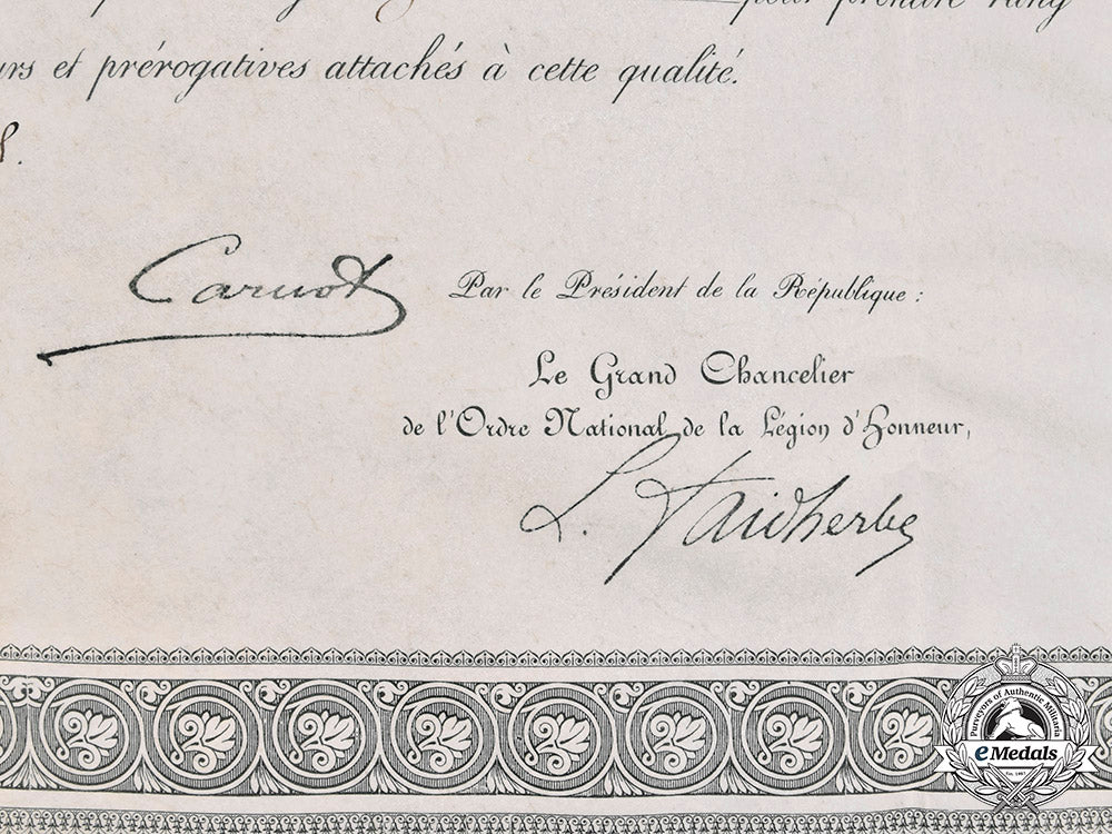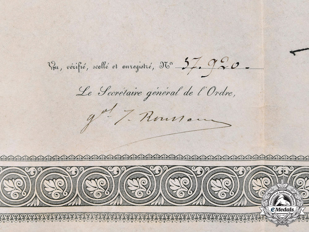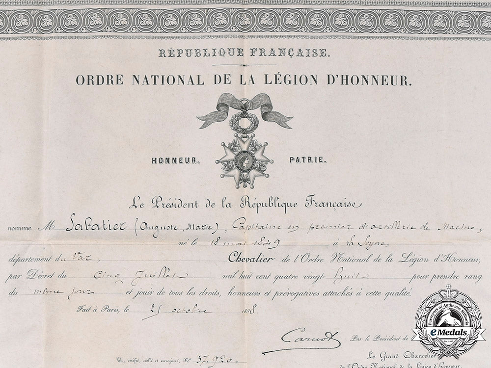 Named to "Marie-Auguste Sabatier, Captain in the 1st Marine Artillery, born on May 18, 1849 in La Seyne", awarded the Order of the Legion of Honour, V Class, Knight (Chevalier) on July 5, 1888, the document dated at Paris on October 21, 1888, numbered "37,920", with three signatures in black ink: French President Marie François Sadi Carnot, the General Secretary of the Order, along with the Grand Chancellor of the National Order of the Legion of Honour, printed in black ink on a white parchment, measuring 542 mm (w) x 435 mm (h), fold marks, wrinkled, soiling evident at the lower left portion, free of tears, fine.