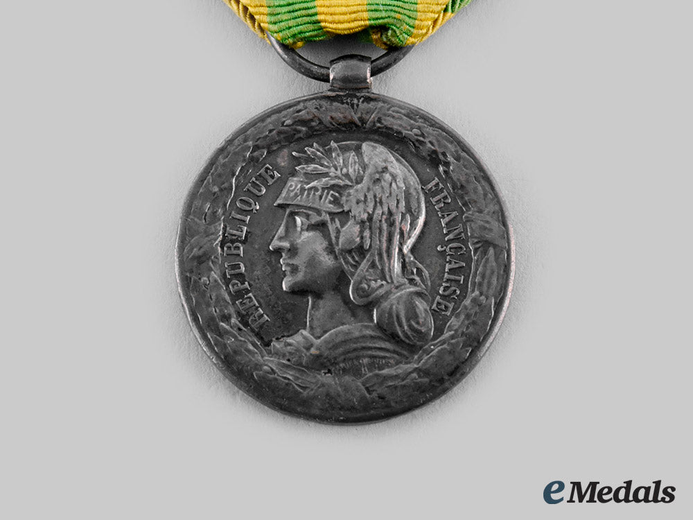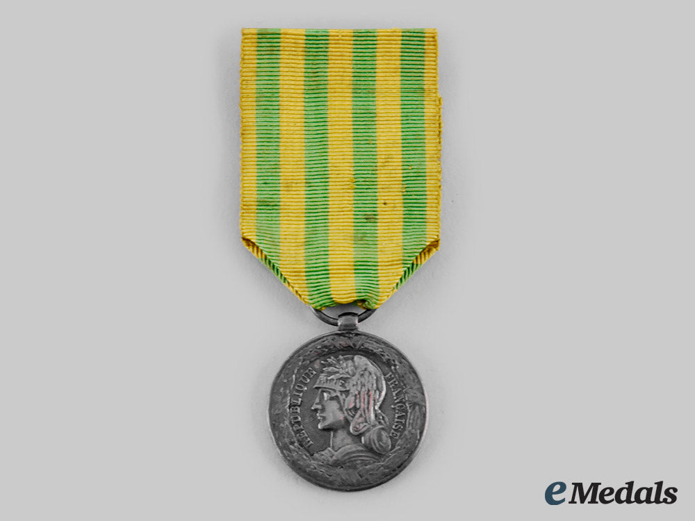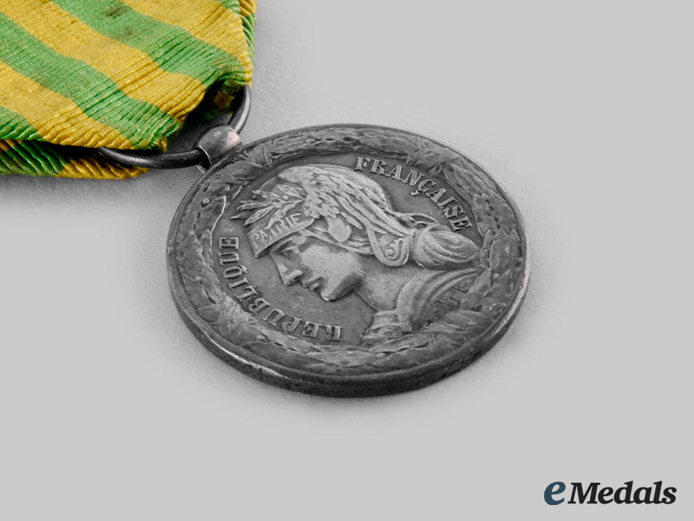 (Médaille commémorative de l'expédition du Tonkin). Instituted in 1885. In silver, engraver marked "DANIEL DUPUIS" on the obverse, cornucopia hallmarked on the reverse, measuring 30 mm in diameter, dark patina, contact marks and surface wear, original ribbon, near very fine.