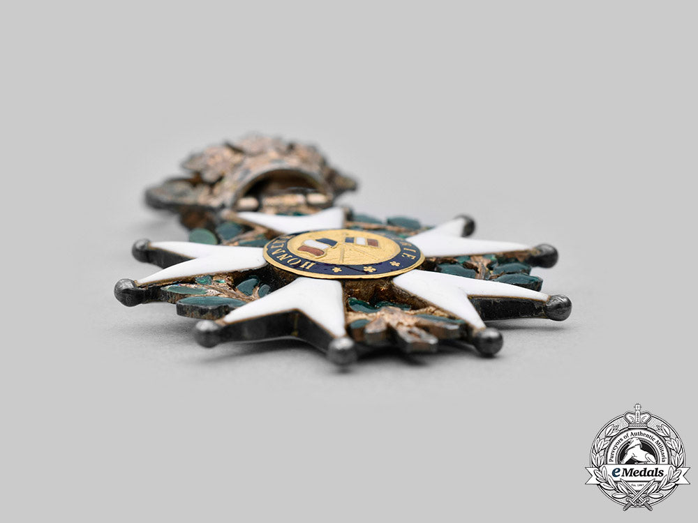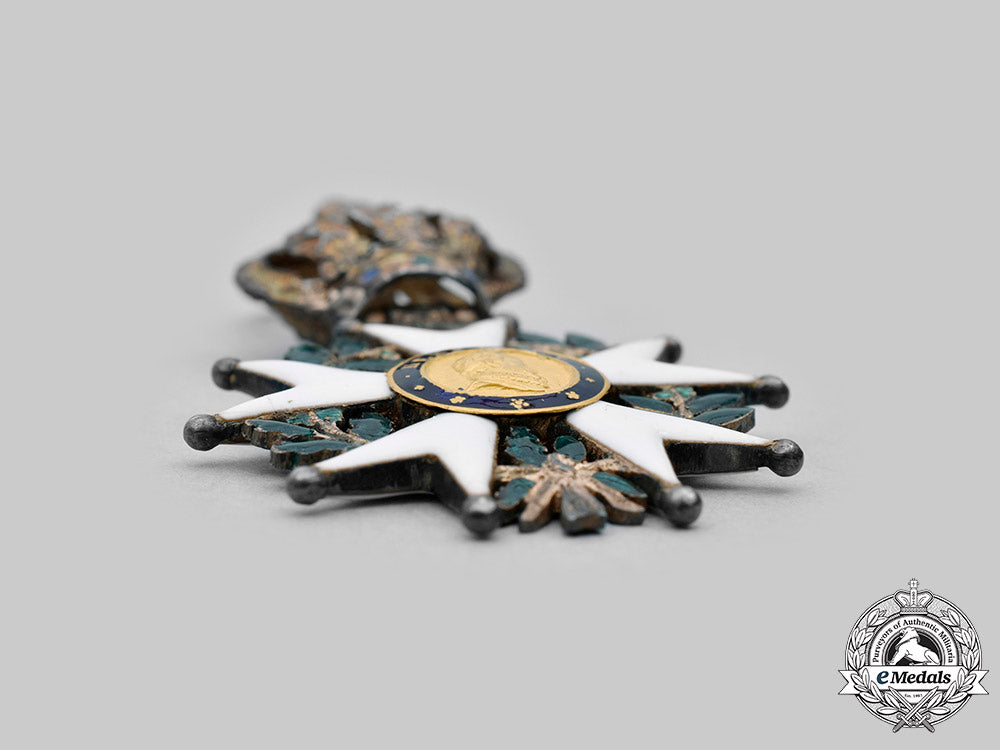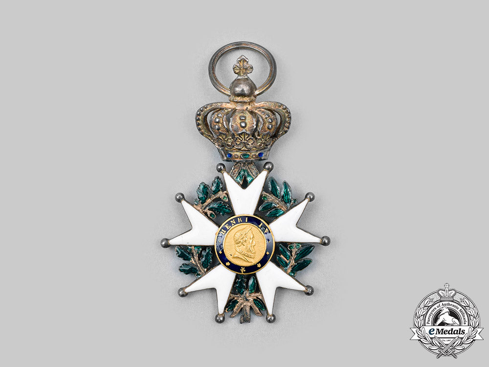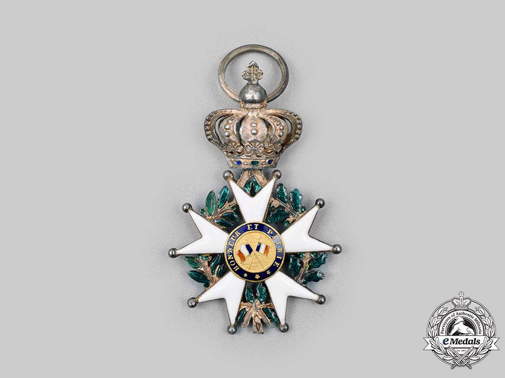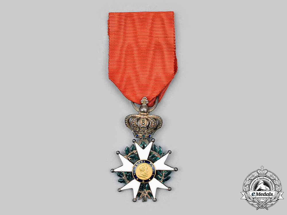 (Ordre National de la Légion d'honneur). Instituted in 1802. (1830-1848). In silver, a white enamel Maltese cross with ball finials, green enamelled laurel and oak leaf wreath segments in each quadrant, the obverse central medallion in Gold features a rightward facing effigy of Henri I surrounded in a blue enamel ring inscribed HENRI VI, the reverse central medallion in Gold presents crossed flags surrounded in a blue enamel ring inscribed HONNEUR ET PATRIE, the badge is suspended from a royal crown with red and green enamelling, measures 37.65mm (w) x 58.90mm (h – including crown suspension), weighs 16.1 grams (including ribbon), silver hallmark at 6 o’clock on the ribbon tassel donating Paris manufacture from 1819-1838, and a Dutch import “V’ mark denoting “Vreemd”, worn on a replacement ribbon, small crack to 9 o’clock white enamel obverse arm otherwise intact, green enamel to wreath is chipping and worn, gilt wear on crown, very fine condition.
