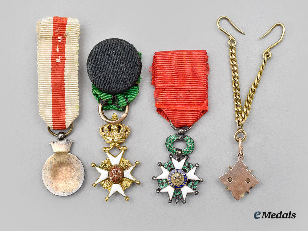 Includes: 1. France, Third Empire: Order of the Legion of Honour (Ordre de la Légion d'Honneur): in silver gilt with red, white, blue and green enamels. 2. Latvia, Republic. 10th Aizpute Infantry Regiment Badge (10th Aizpute Kājnieku Pulks): in silver with red, white and blue enamels. 3. Spain, Francoist Era. Spanish Red Cross Medal, II Class Officer 1931-1939 (Medalla 2ª Clase Cruz Roja Española): in silver with red, white and black enamels. 4. Sweden, Kingdom. Order of Vasa (Kungliga Vasaorden): in Gold with red and white enamels. Intact enamels, three with original ribbons, the Latvian badge on a chain, extremely fine.