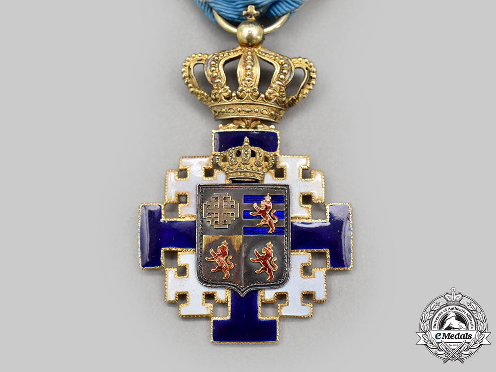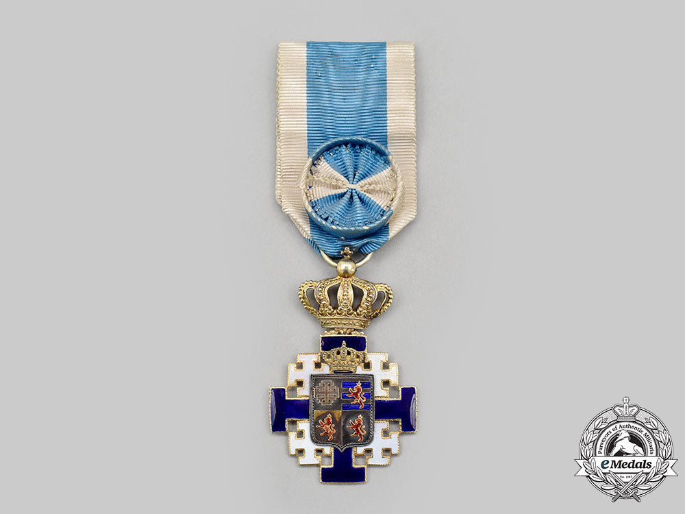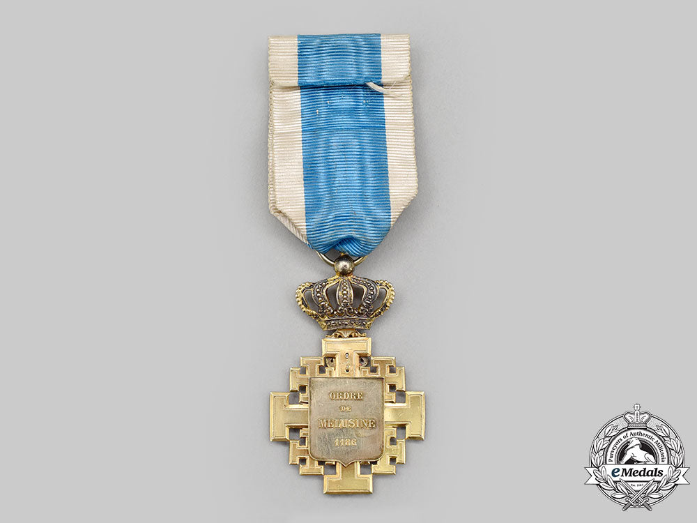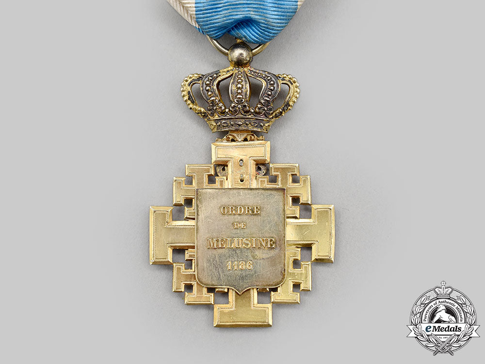 (Ordre de Mélusine, Chevalier). Instituted in 1881. Multi-piece construction, in silver gilt with navy blue, white and red enamels, the base formed by a Jerusalem cross, obverse illustrating the coat-of-arms of the Lusignan kings of Cyprus (1192-1489) in the centre that is surmounted by a crown, reverse inscribed "ORDRE DE MELUSINE 1186" (Order of Melusine 1186) upon a shield base in the centre, measuring 40 mm (w) x 64 mm (h) inclusive of its crown suspension, intact enamels, large rosette affixed to its original ribbon, extremely fine.
