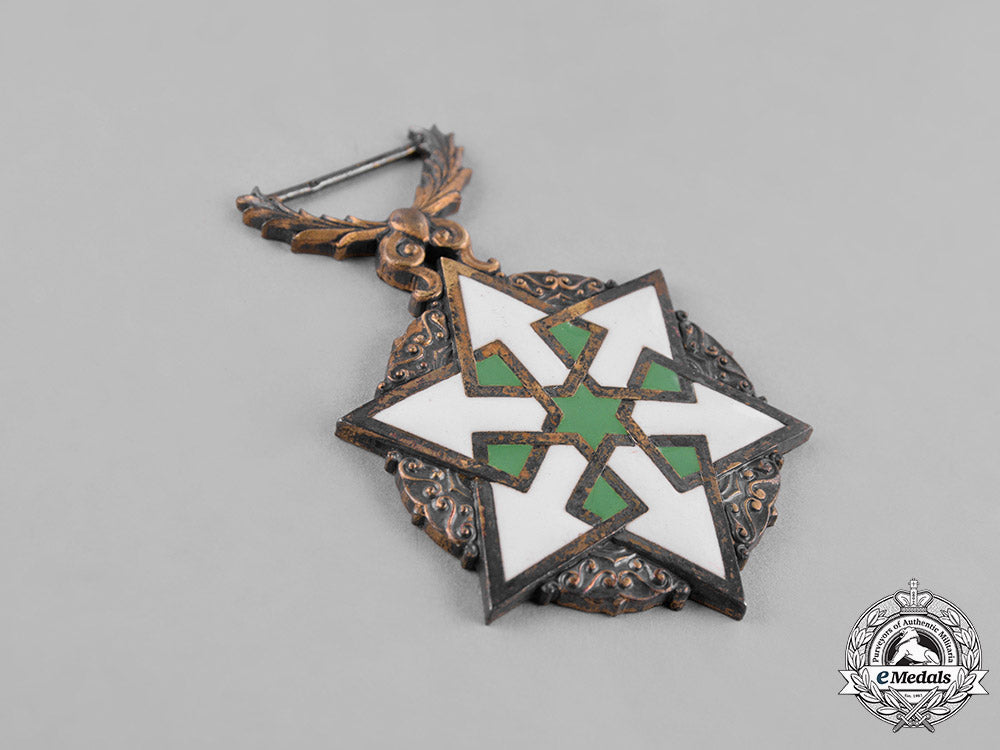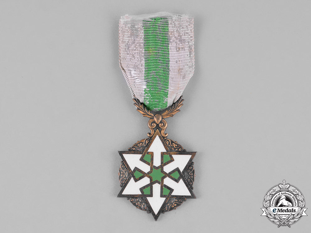 (Arabic: وسام الاستحقاق المدني). (French: Ordre du Mérite). Instituted on 1926. Type I. (1926-19563 Issue). In silver gilt, featuring a white enameled star composed of arrow points, a green stylized floral overlay with ornate gatherings in each quadrant, reverse referencing ""Service to the state or to the 'Arab cause'"" in Arabic script, maker marked by ""ARTHUS BERTRAND"" and marked ""DÉPOSÉ"" (Deposit), measuring 39 mm (w) x 63 mm (h - inclusive of laurel integral suspension), with period delicate ribbon, otherwise very fine.