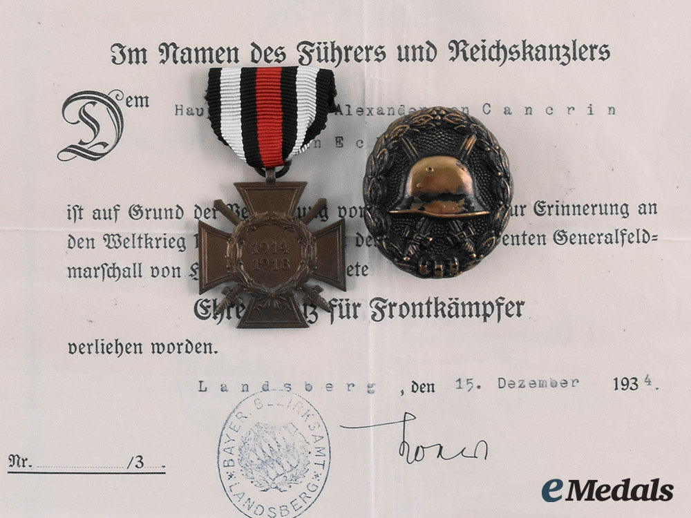 An Honour Cross of the World War 1914/1918 Award Document, on cream-coloured paper, awarded to the Captain Alexander von Cancrin in Landsberg on 15 December 1934. The document is not numbered, but stamped and signed. Presenting two folding creases, with slight creasing and scuffing. Measuring 211 mm (w) x 149 mm (h), in overall extremely fine condition.