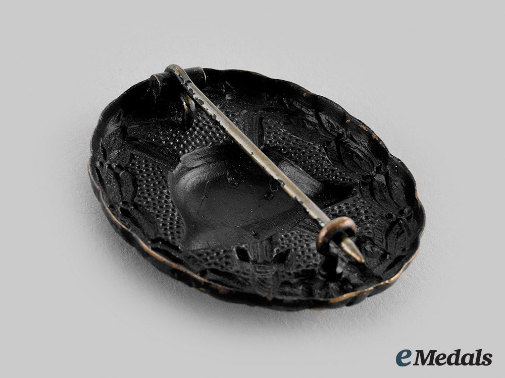 Germany, Imperial. A Wound Badge, Black Grade, (Verwundetenabzeichen in Schwarz). Constructed of blackened bronze, the obverse consisting of an oval laurel wreath, with a central Stahlhelm on top of crossed swords on a pebbled field, the reverse with a barrel hinge and vertical pinback meeting a round wire catch, unmarked, measuring 37.35 mm (w) x 42.81 mm (h), weighing 7.6 grams, in very fine condition.