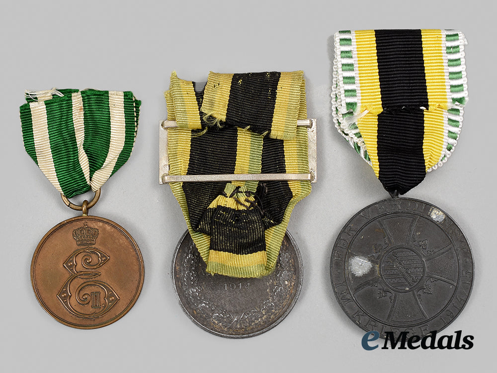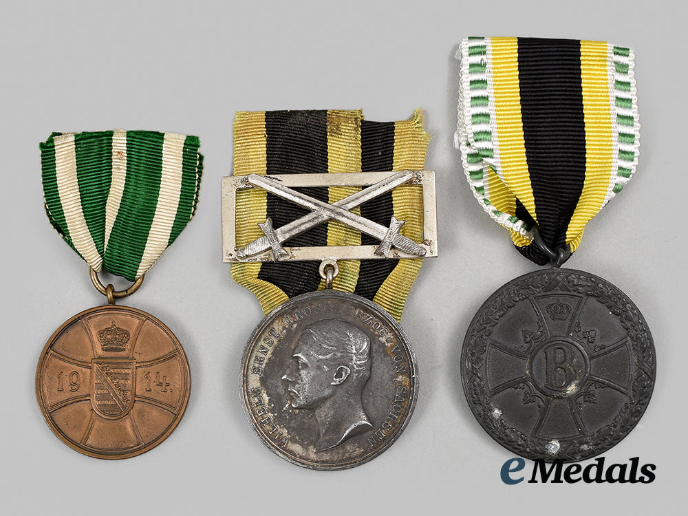 1. A Saxe-Weimar and Eisenach General Honour Decoration, Military Class, Silver Grade, constructed of silvered zink, on loop for suspension from its period original ribbon with sword clasp, the obverse bearing a raised and leftward-facing profile of Grand Duke Ernst Wilhelm, circumscribed by name and title, the reverse bearing a central inscription of “DEM VERDIENST 1914” (“TO MERIT 1914”), situated within circular oak leaf wreath, unmarked, measuring 36.13 mm in diameter, weighing 25.4 grams (inclusive of ribbon and clasp), demonstrating near-total loss of silver finish and some surface oxidation, in fair condition.