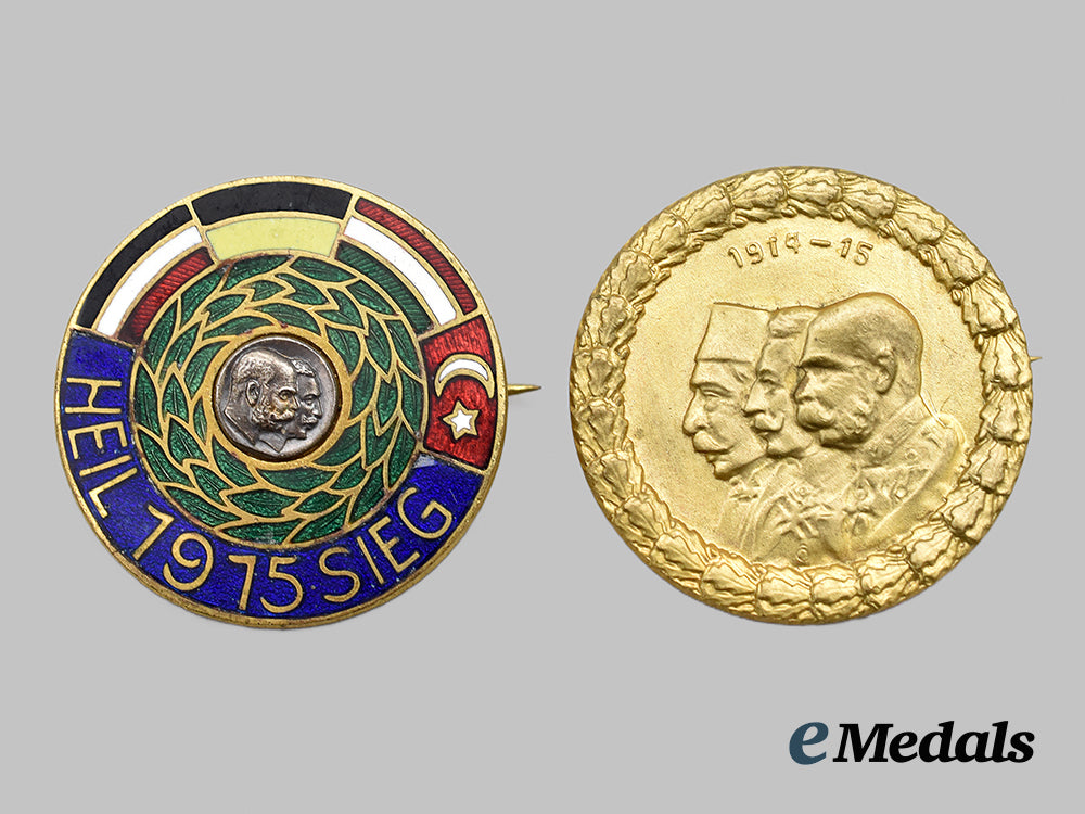 1. One constructed of gilded bronze, the obverse consisting of a circular oak leaf wreath, surrounding central raised busts of Kaiser Wilhelm II, Emperor Franz Joseph, and Sultan Mehmed V, the reverse with a horizontal pinback, unmarked, measuring 26 mm in diameter, in extremely fine condition.