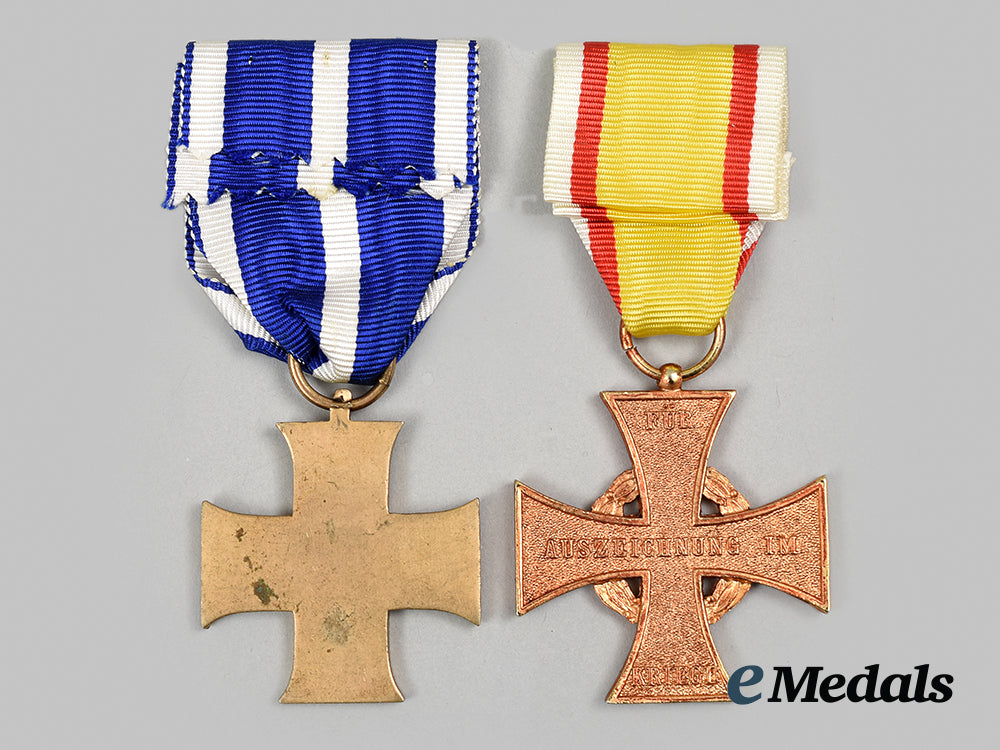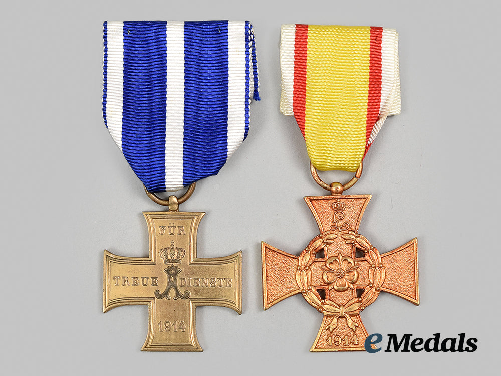 1. A Schaumburg-Lippe Faithful Service Cross, constructed of gilded bronze, on loop for suspension from its period original ribbon, consisting of a Geneva Cross, the obverse bearing a central raised monogram of Prince Adolph, circumscribed by an inscription of “FÜR TREUE DIENSTE 1914” (“FOR FAITHFUL SERVICE 1914”) distributed across the arms, unmarked, measuring 35.90 mm (w) x 40.41 mm (h), weighing 16.6 grams, in extremely fine condition.