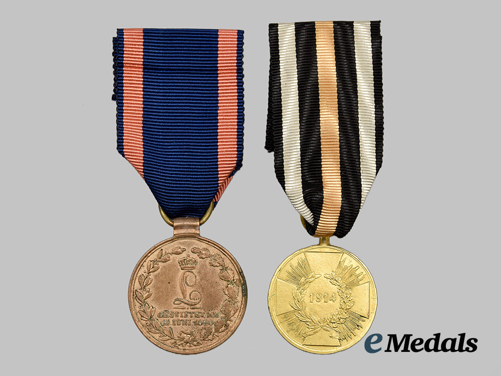 1. A Prussian Commemorative Medal for Combatants of 1814, constructed of gilded bronze, on loop for suspension from a replacement ribbon, unmarked, measuring 29.18 mm in diameter, 16.3 grams, in extremely fine condition.