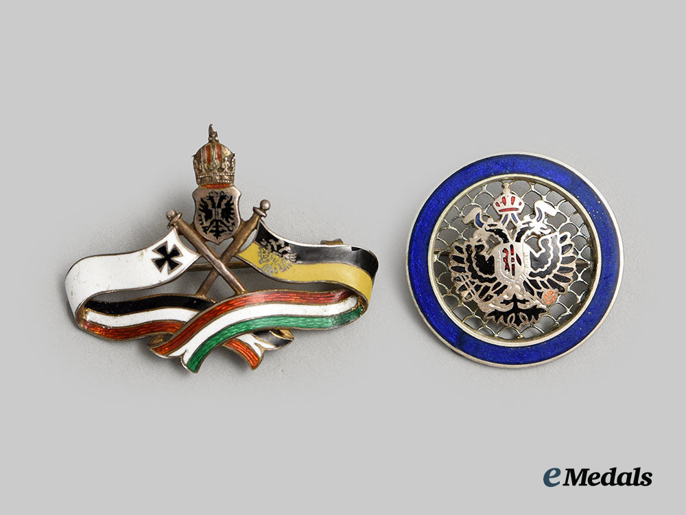 1. United Forces German Imperial and Austro-Hungarian Empire Badge: in silver with red, white, black, green and yellow enamels, assay office marked twice with an "A" (Vienna) and maker marked "K.L." on the pin, illustrating two flagpoles, each with a flowing ribbon banner, the German one at the left and bearing an Iron Cross, the Austro-Hungarian one at the right bearing the two-headed eagle coat-of-arms, with the Austrian coat-of-arms between the flagpoles and surmounted by the Austrian crown, measuring 43.5 mm (w) x 34.3 mm (h), horizontal pinback.
