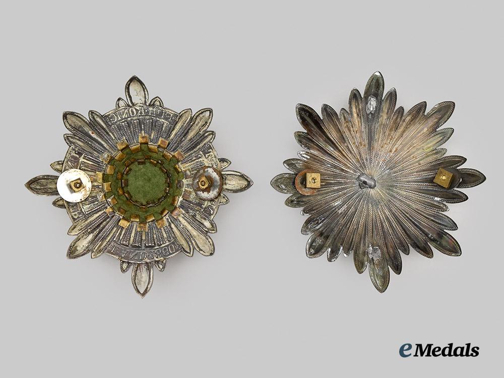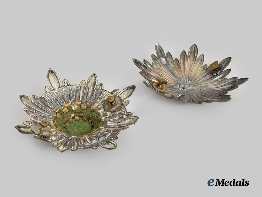 2. A Saxon plate, constructed of silvered bronze, the obverse consisting of a vaulted eight-pointed starburst, overlaid by a central crowned and wreathed Saxon coat of arms, the reverse with two threaded screwposts retaining original nuts and washes, unmarked, measuring 12 cm (w) x 12 cm (h), in extremely fine condition.