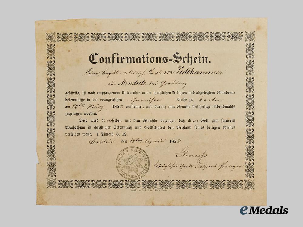 12. A Certificate to Kuno Bogislaw Adolph Carl von Puttkammer from Mendritz bei Gaudenz for his Confirmation in the Evangelical Church on March 20th, 1853, issued on April 13th, 1853, consisting of a page of paper with partially printed and neatly handwritten writing, measuring 208 mm (w) x 169 mm (l), with a small tear on the bottom margin along with a small unintentional fold on the left margin, in overall very fine condition.