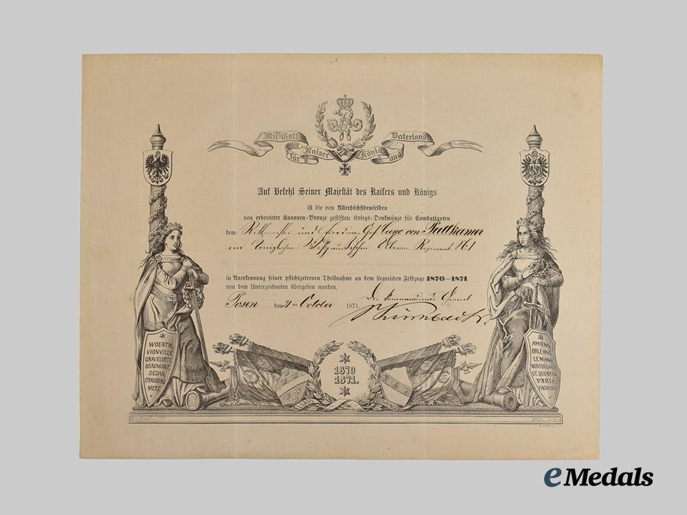 6. An award document to Rittmeister and Squadron Leader Kuno von Puttkammer of the Royal West-Prussian Ulanen Regiment 1 for a War Commemorative Medal of 1870-1871 for his participation in the Franco-Prussian War, issued in Posen on October 21st, 1871, consisting of a large page of paper with partially printed and neatly handwritten writing, measuring 292 mm (w) x 228 mm (l), without tears, folds, or major staining of any kind, in overall better than extremely fine condition.