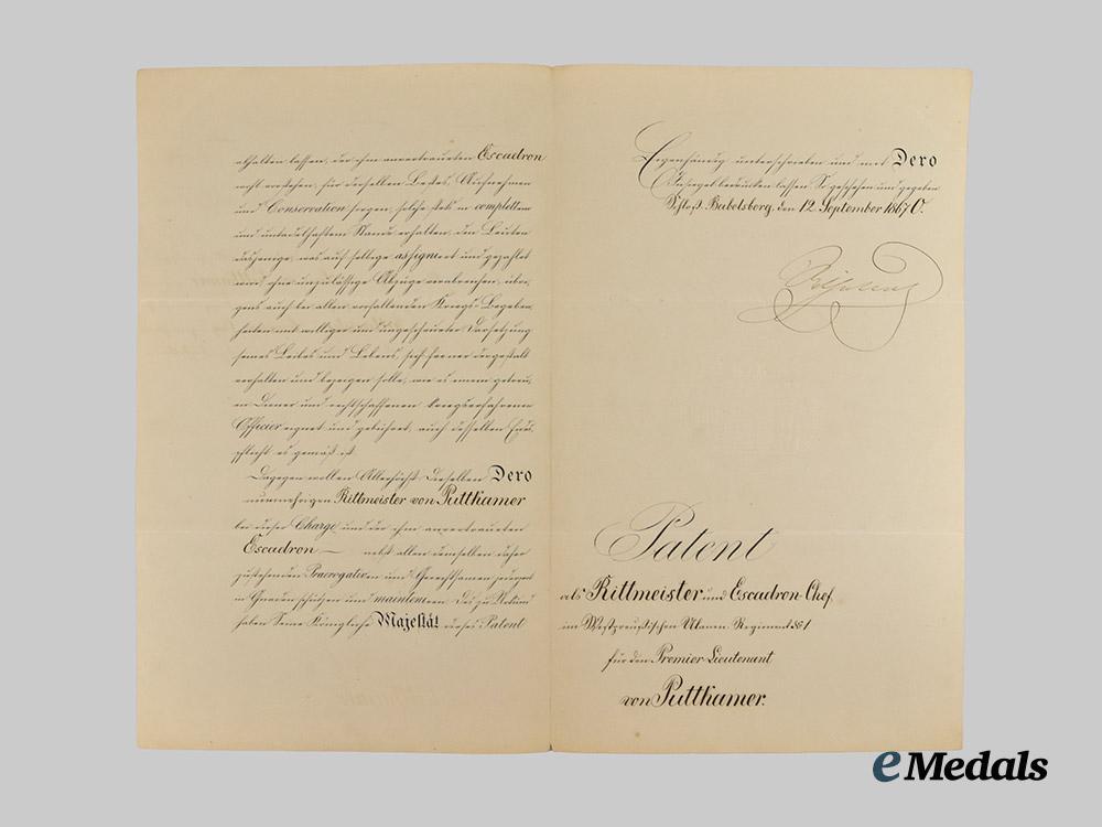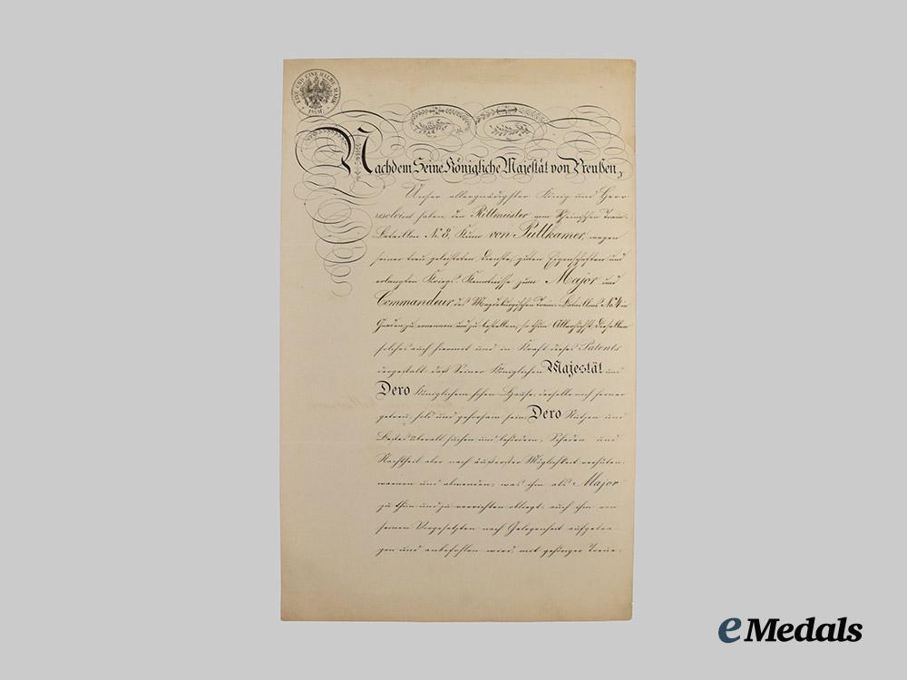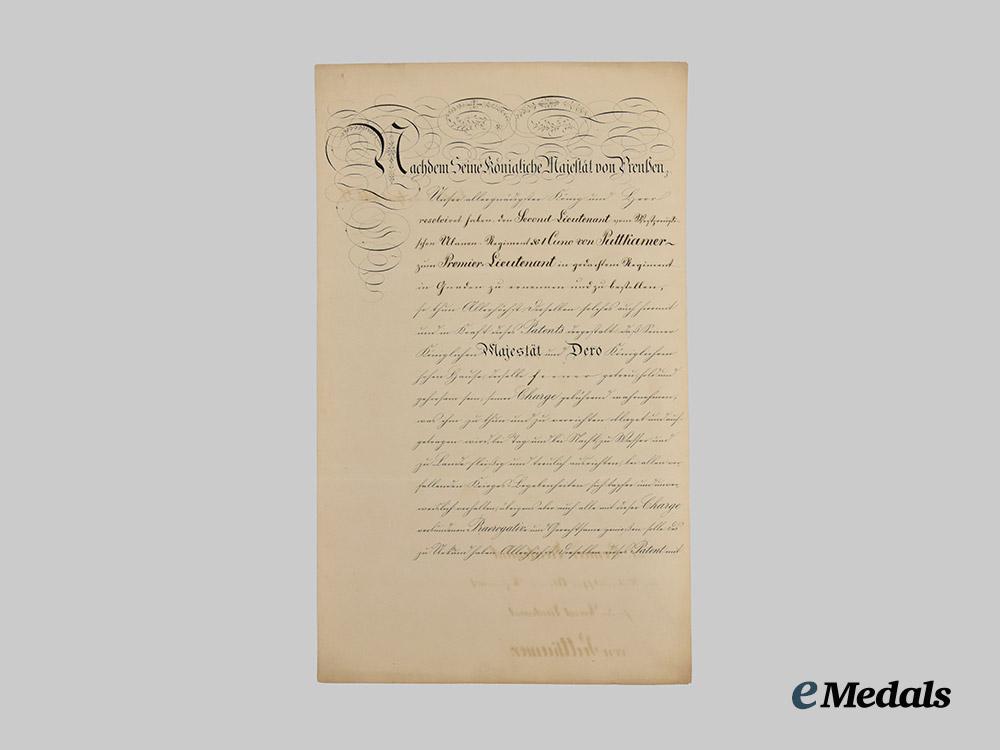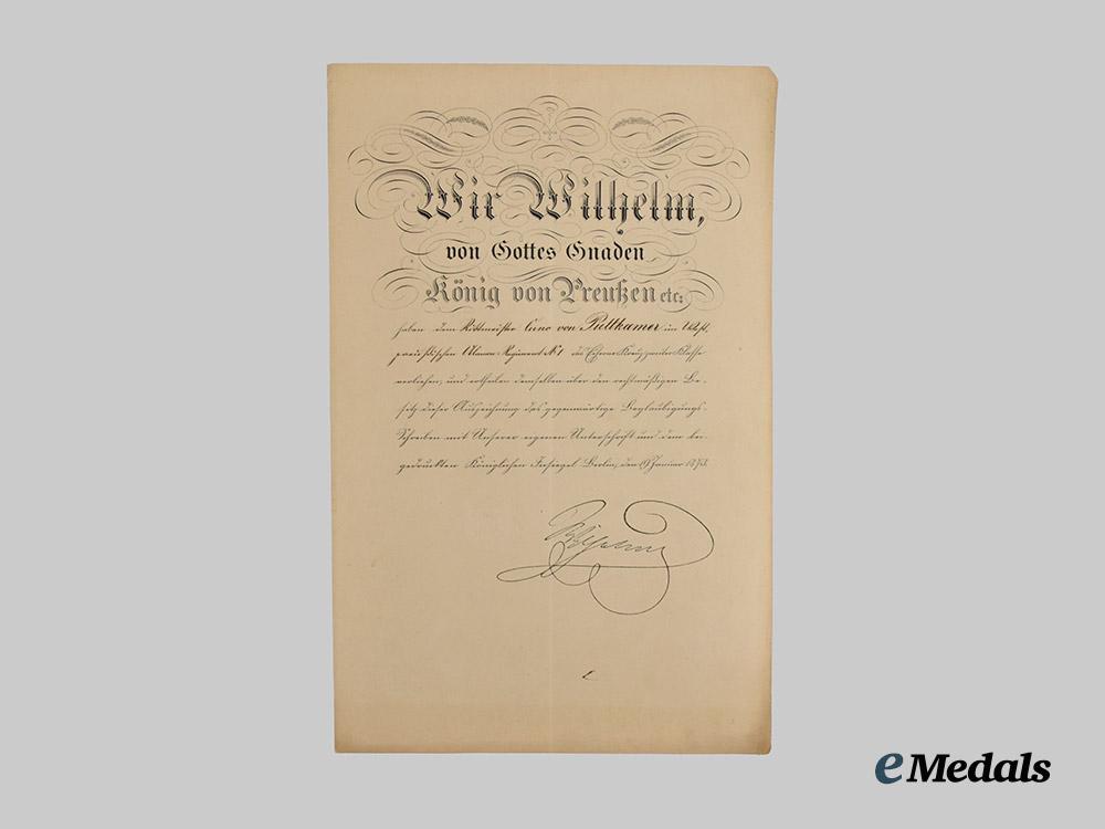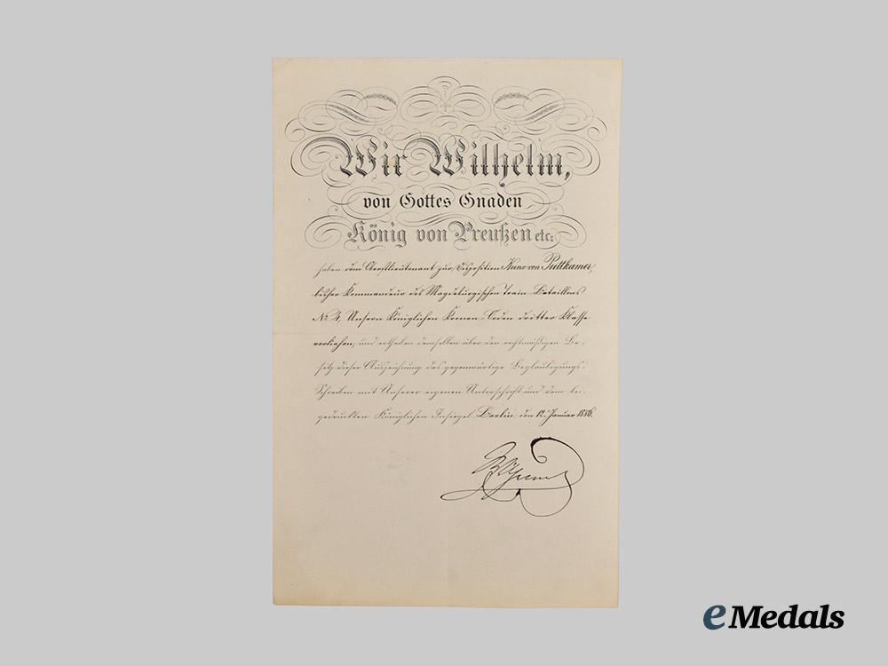8. A promotional document to Leutnant Kuno von Puttkammer of the Ulanen Regiment 1 being promoted to Rittmeister, issued in Schloss Babelsberg on September 12th, 1867, and bearing the signature as well as the seal of the King of Prussia and Emperor of the Holy Roman Empire, Kaiser Wilhelm I, consisting of a large page of paper folded in half along the landscape axis with partially printed and neatly handwritten writing on most sides of the page, measuring 221 mm (w) x 362 mm (l) as presented, without tears, folds, or major staining of any kind, in overall better than extremely fine condition.