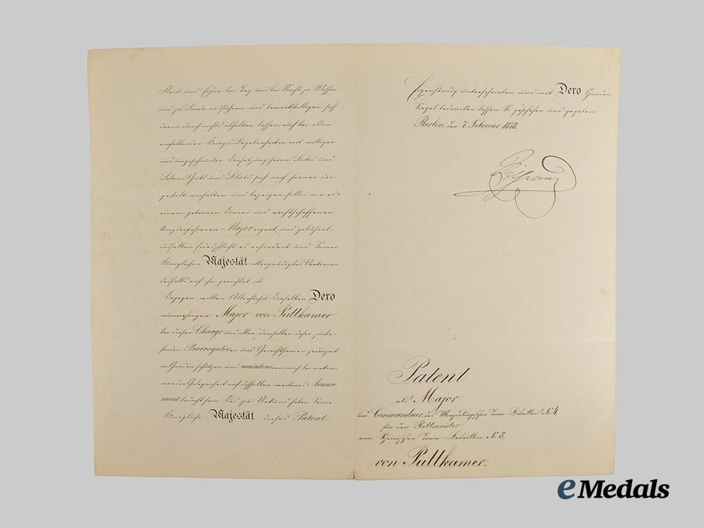 3. A promotional document to Rittmeister Kuno von Puttkammer of the Rhine Battalion 8, for being promoted to Major and Commander of the Magdeburg Battalion 4, issued in Berlin on January 7th, 1878, and bearing the signature as well as the seal of the King of Prussia and Emperor of the Holy Roman Empire, Kaiser Wilhelm I, consisting of a large page of paper folded in half along the landscape axis with partially printed and neatly handwritten writing on most sides of the page, measuring 220 mm (w) x 358 mm (l) as presented, without tears, folds, or major staining of any kind, in overall better than extremely fine condition.