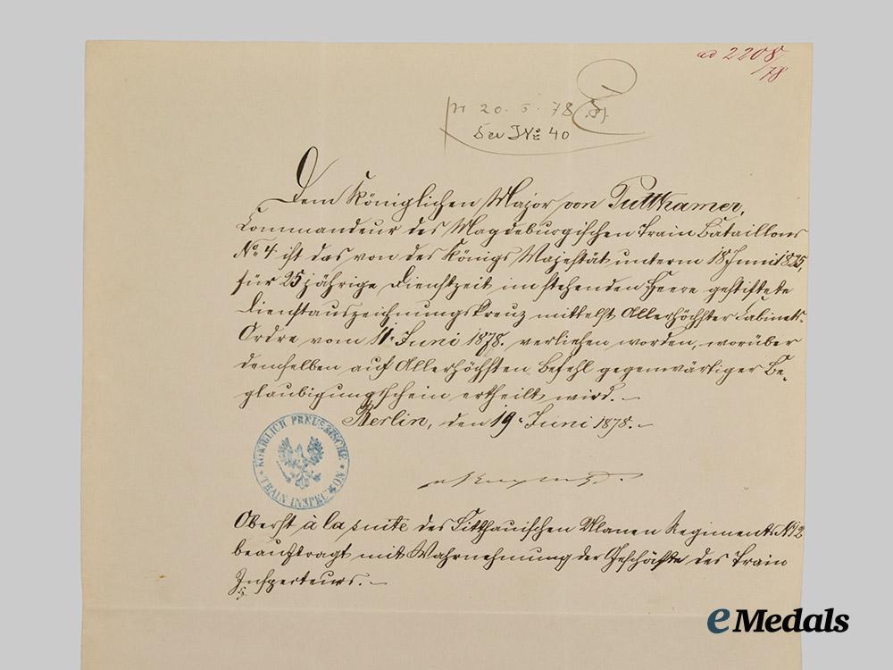 5. An award document to Major Kuno von Puttkammer, Commander of the Magdeburg Battalion 4 for a Long Service Cross for 25 Years of Service, consisting of a large page of paper folded in half along the landscape axis with neatly handwritten writing, measuring 210 mm (w) x 328 mm (l) as presented, with multiple folds present, but without tears or major staining of any kind, in overall better than extremely fine condition.