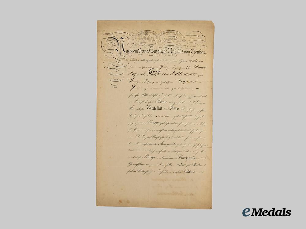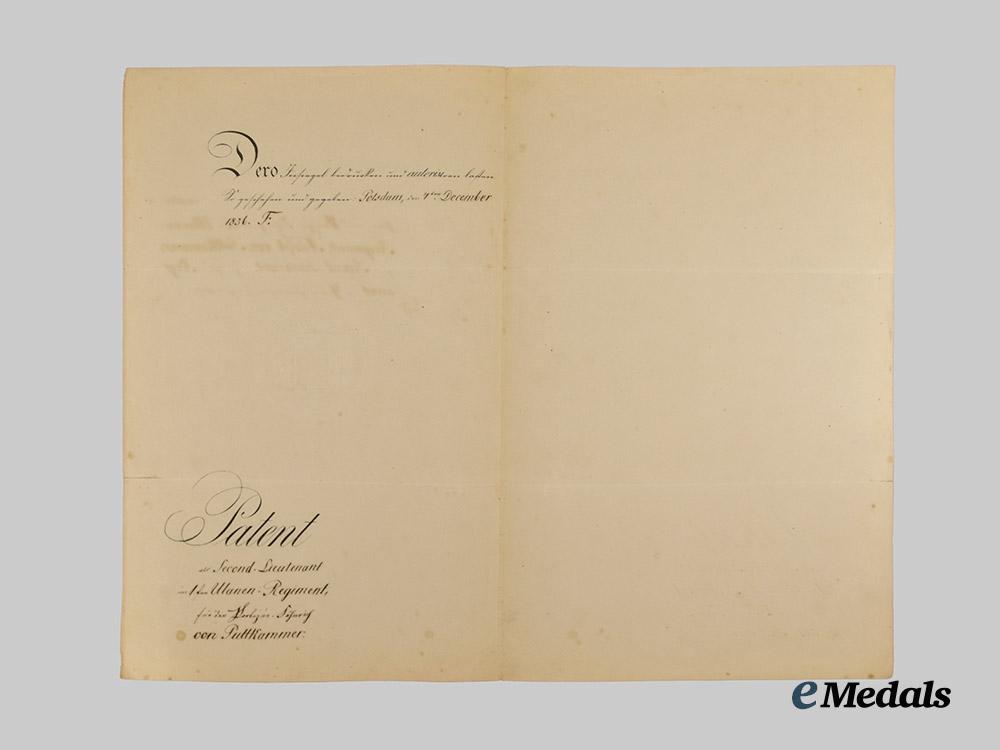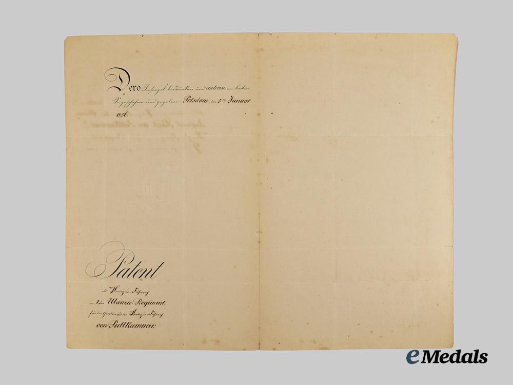 10. A promotional document to Second Fähnrich Kuno von Puttkammer of the Ulanen Regiment 1 being promoted to First Fähnrich, issued in Potsdam on January 5th, 1856, consisting of a large page of paper folded in half along the landscape axis with partially printed and neatly handwritten writing on most sides of the page, measuring 229 mm (w) x 368 mm (l) as presented, without tears, folds, or major staining of any kind, in overall better than extremely fine condition.