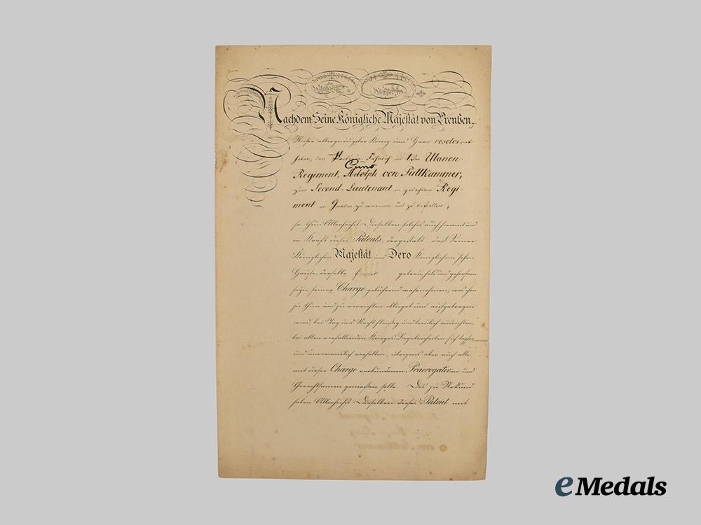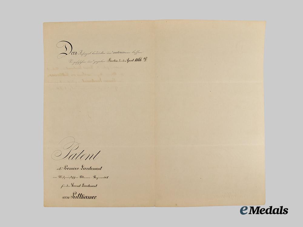 9. A promotional document to Second Lieutenant Kuno von Puttkammer of the West-Prussian Ulanen Regiment 1 being promoted to Premier-Leutnant, issued in Berlin on April 3rd, 1866, consisting of a large page of paper folded in half along the landscape axis with partially printed and neatly handwritten writing on most sides of the page, measuring 220 mm (w) x 365 mm (l) as presented, without tears, folds, or major staining of any kind, in overall better than extremely fine condition.