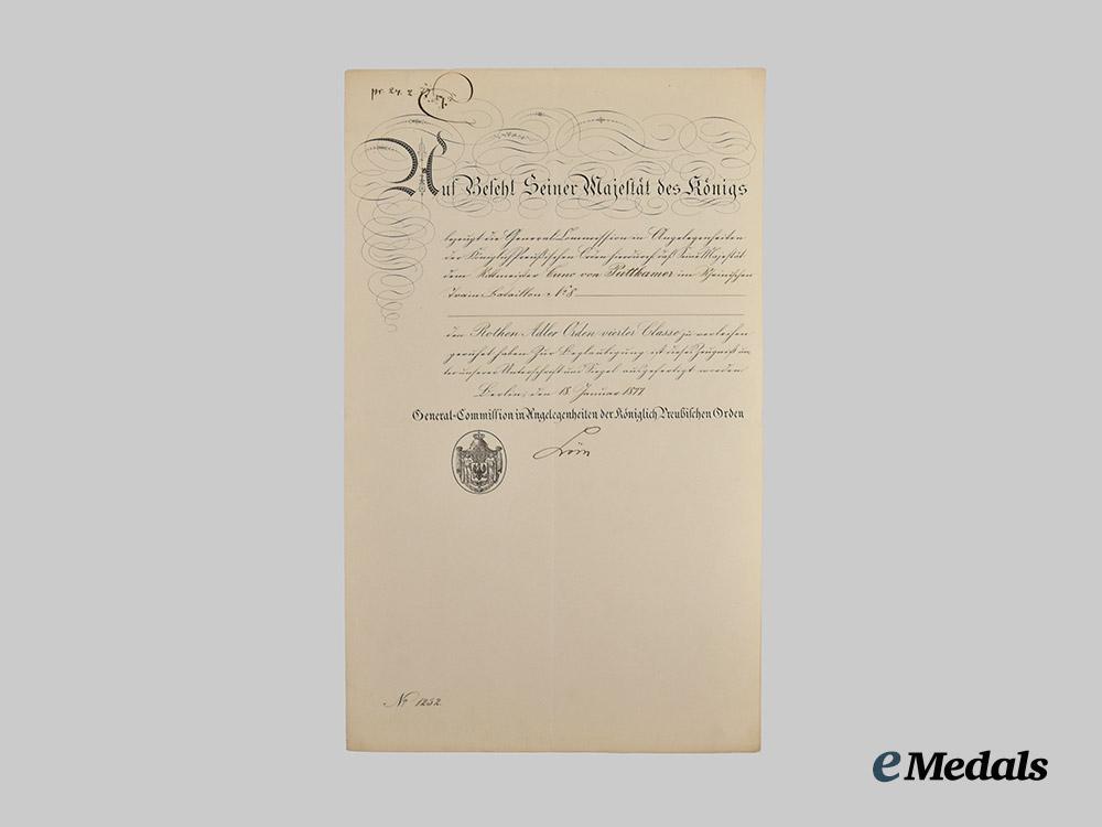 7. An award document to Rittmeister Kuno von Puttkammer of the Rhein Battalion 8 for a Red Eagle Order IV Class, issued in Berlin on January 18th, 1877, consisting of a large page of paper folded in half along the landscape axis with neatly handwritten writing, measuring 220 mm (w) x 359 mm (l) as presented, without tears, folds, or major staining of any kind, in overall better than extremely fine condition.
