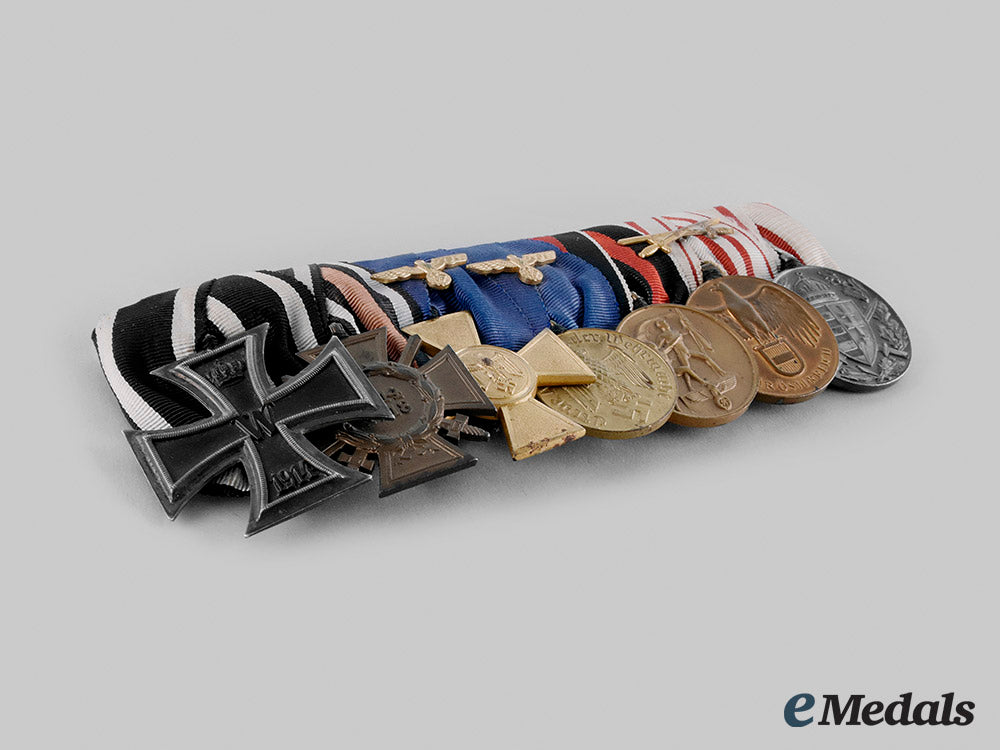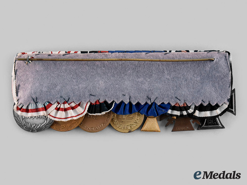 A seven place medal bar consisting of: a1914 Iron Cross II Class, (Eisernes Kreuz 1914 II. Klasse). Reinstituted 5 August 1914. (1914-1918 issue). Constructed of silver, consisting of a Cross Pattée with a blackened core within a ribbed silver frame, the obverse with a central initial “W”, the six o’clock arm with a reinstitution date of “1914”, the twelve o’clock arm with a royal crown, the reverse with three central oak leaves, the six o’clock arm with an initial institution date of “1813”, the twelve o’clock arm with initials “FW” topped by a royal crown, indistinguishable maker mark on suspension ring with black and white ribbon, measuring 42.66 mm (w) x 43.12 mm (h); .