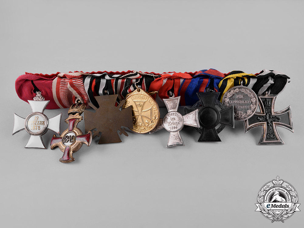 (Ordensschnalle). An extensive First War period medal bar featuring eight decorations, including a 1914 Iron Cross II Class, constructed of iron and silver, on loop for suspension from its period original ribbon, consisting of a Cross Pattée with a blackened magnetic iron core within a ribbed silver frame, the obverse with a central initial W, the six o’clock arm with a reinstitution date of “1914”, the twelve o’clock arm with a royal crown, the reverse with three central oak leaves, the six o’clock arm with an initial institution date of “1813”, the twelve o’clock arm with initials “FW” topped by a royal crown, unmarked, measuring 42.72mm (w) x 46.59 mm (h), in extremely fine condition.