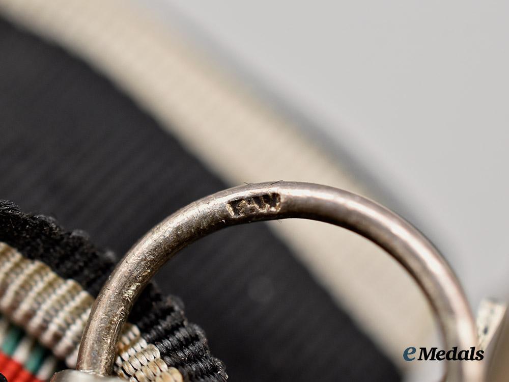 1. A 1914 Iron Cross II Class, constructed of iron and silver, on loop for suspension with its period original ribbon, consisting of a Cross Pattée with a blackened magnetic iron core within a ribbed silver frame, the obverse with a central initial “W”, the six o’clock arm with a reinstitution date of “1914”, the twelve o’clock arm with a royal crown, the reverse with three central oak leaves, the six o’clock arm with an initial institution date of “1813”, the twelve o’clock arm with initials “FW” topped by a royal crown, the suspension loop stamped with an illegible maker’s mark, measuring 43.28 m (w) x 47.12 mm (h), in near mint condition.