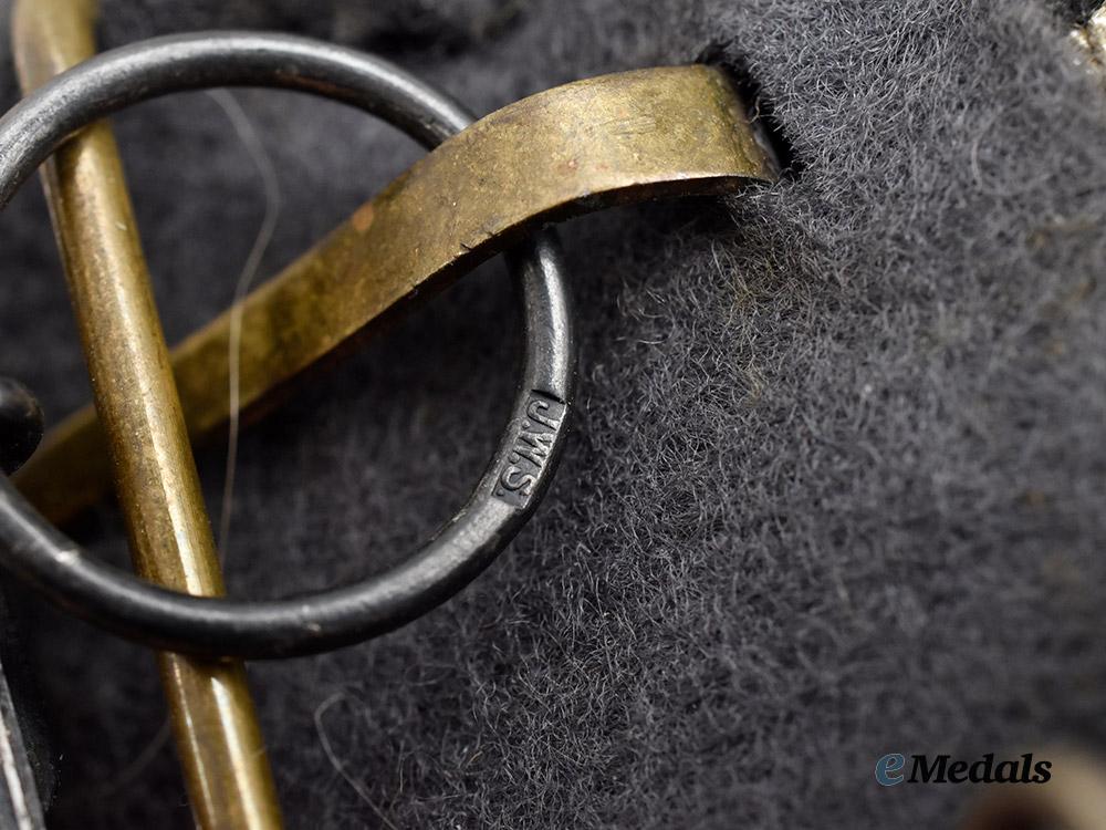 2. A Bavarian Military Merit Cross, II Class with Crown and Swords, constructed of a silver alloy with multi-coloured enamels, consisting of a Maltese Cross with pebbled arms, the obverse bearing a central black enameled medallion overlaid by a raised monogram of King Ludwig II, situated within a stylized white enameled belt and buckle, bearing an inscription of “MERENTI” (“MERIT”) with arabesques, the twelve o’clock arm riveted with a crossed sword clasp, the reverse bearing a central raised Bavarian lion rampant, situated within a stylized belt and buckle bearing an institution date of “1866” with arabesques, the twelve o’clock arm topped by a crown suspension with a loop connecting to a period original ribbon, unmarked, measuring 43.30 mm (w) x 66.28 mm (h), weighing 23.4 grams, in extremely fine condition.
